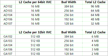 Nvidia는 또한 RTX 4000 GPU에서 L2 캐시의 양을 대폭 늘릴 계획인 것으로 보입니다. 가장 강력한 AD107 다이는 32MB를 자랑하고 AD102에서는 96MB를 차지합니다. 이것은 RTX 4000 카드가 GA102에서 발견된 양의 6-16배 사이일 수 있음을 의미하지만 이것이 실제 성능에 어떤 영향을 미치는지 확인해야 합니다.