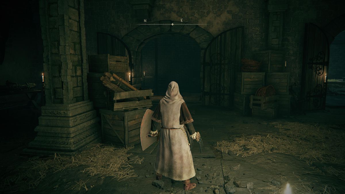 멀리서 최대한 많은 적을 제거한 후 남동쪽으로 계단을 내려가세요. 문을 통과하여 황금 룬[5] 의 유적을 약탈하고 , 레버를 눌러 Stormveil Castle 정문을 열고, 동쪽을 향한 문을 통해 나가서 Commoner's Simple Garb의 유적을 약탈하고, 은혜의 Gateside Chamber 사이트를 활성화합니다 .