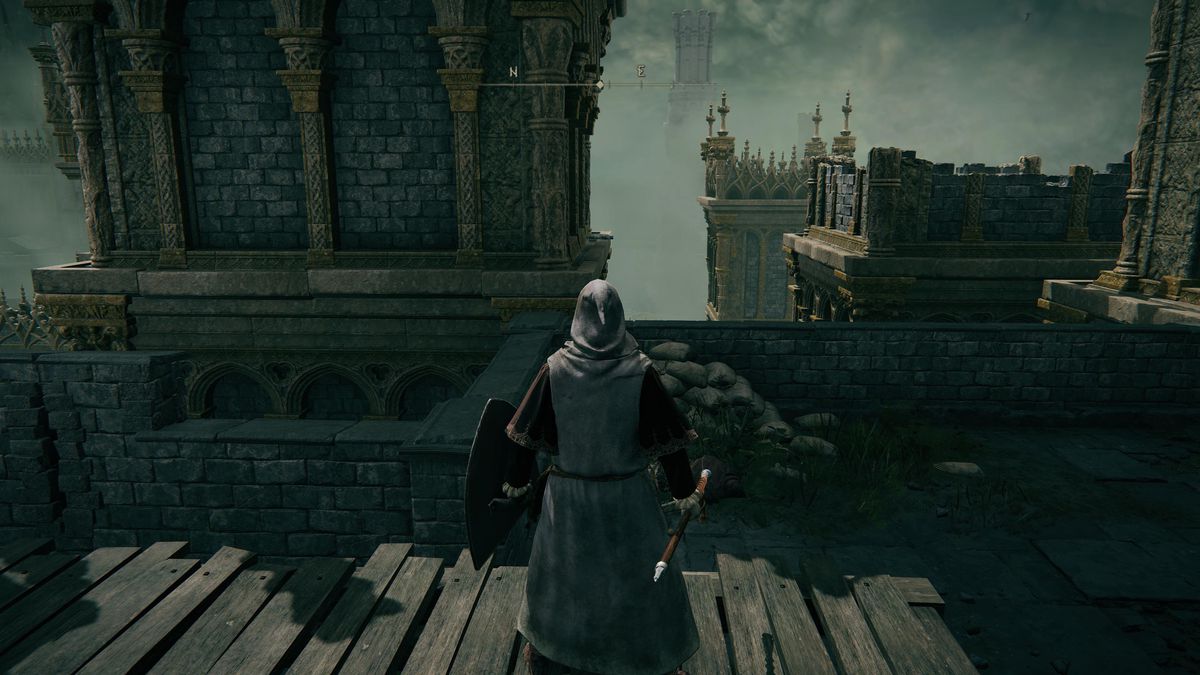 북쪽으로 향하여 인접한 지붕을 건너십시오. 편리한 위치에 있는 폐허 위로 점프하여 위로 올라가는 길을 만드세요. 위로 네 명의 망명자를 물리치고 사다리 를 올라갑니다 . 상단에서 "점프 공격을 강화" 하는 Claw Talisman 을 위해 몸체를 약탈하십시오.