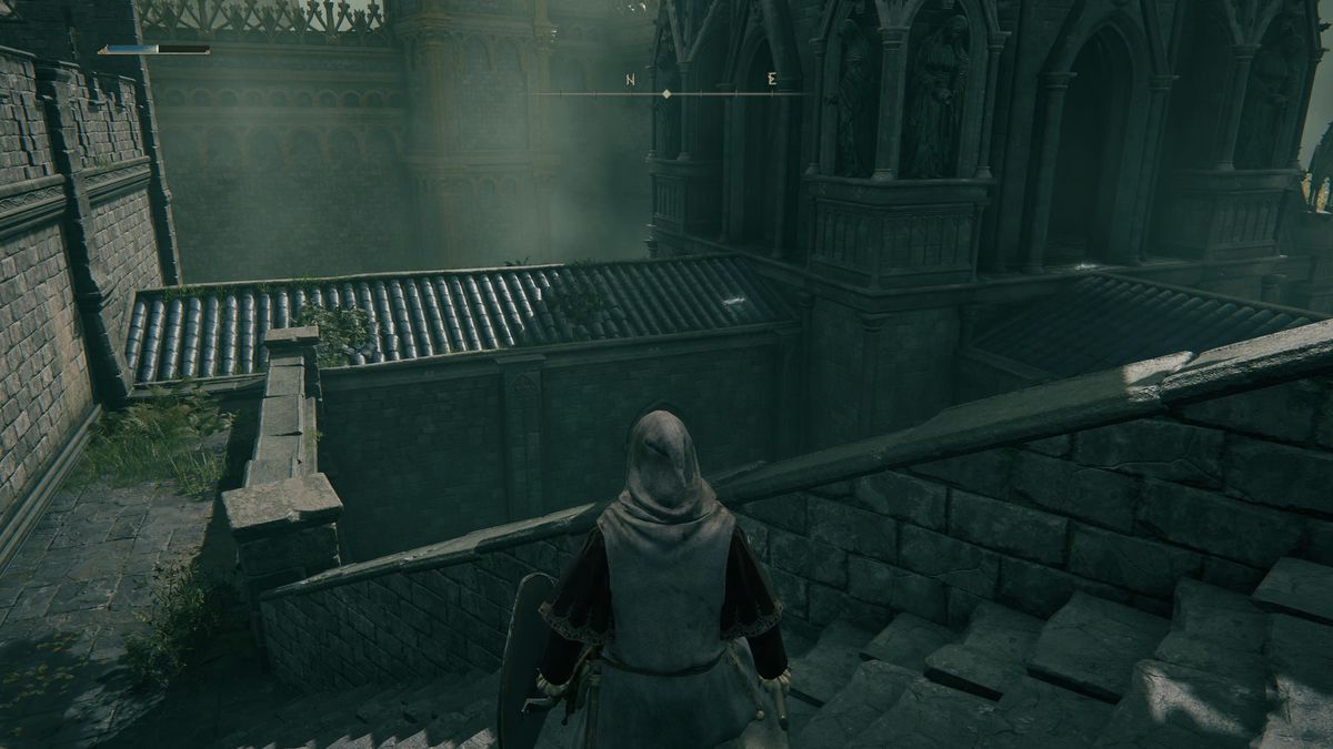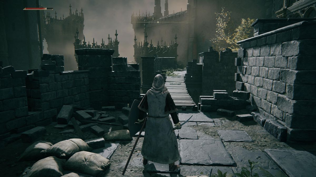 문을 나와 왼쪽으로 도십시오. 난간 너머를 내려다보면 아래쪽에 난간이 보입니다. 아래로 점프하여 길을 따라가면 첫 번째 기사 싸움 근처에서 접근할 수 없었던 벽의 구멍으로 이어집니다. 설명에 따르면 "매우 희귀한" 제작 아이템인 Arteria Leaf를 얻기 위해 시체를 약탈하십시오.