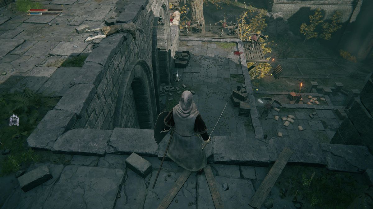 아래로 점프하고 부서진 빔 위로 다시 점프합니다. Smithing Stone[2] 을 위해 시체를 약탈하십시오 .