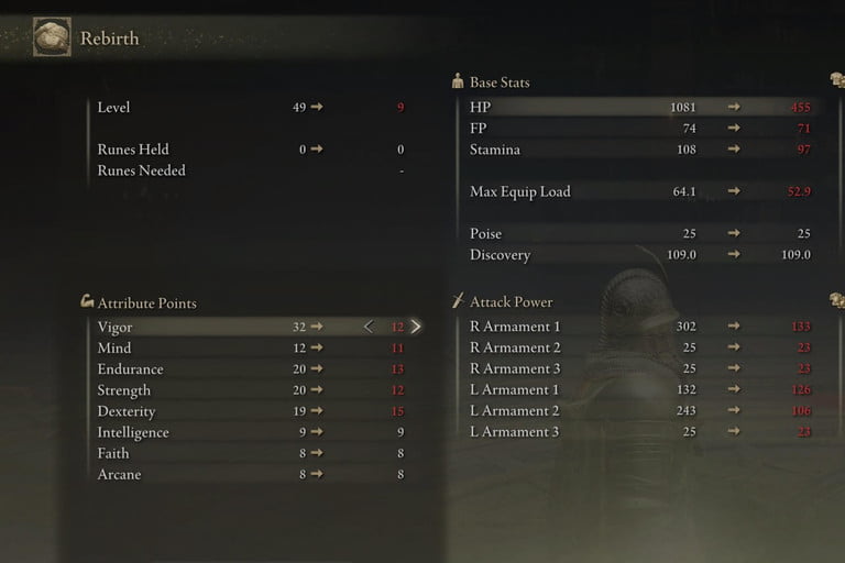 현재 레벨에 도달할 때까지 모든 통계를 재할당해야 합니다. 또한 초기 시작 레벨 아래로 스탯을 낮출 수 없습니다. 그렇기 때문에 경험 많은 Soul 플레이어들이 박탈된 클래스 ( Elden Ring 의 Wretch )를 선택합니다. Wretch는 레벨 1에서 시작하는 반면, 다른 클래스는 레벨 9 또는 10에서 시작합니다. 재지정할 때 기본 통계에 제한되지 않으므로 재할당할 추가 포인트가 있습니다.