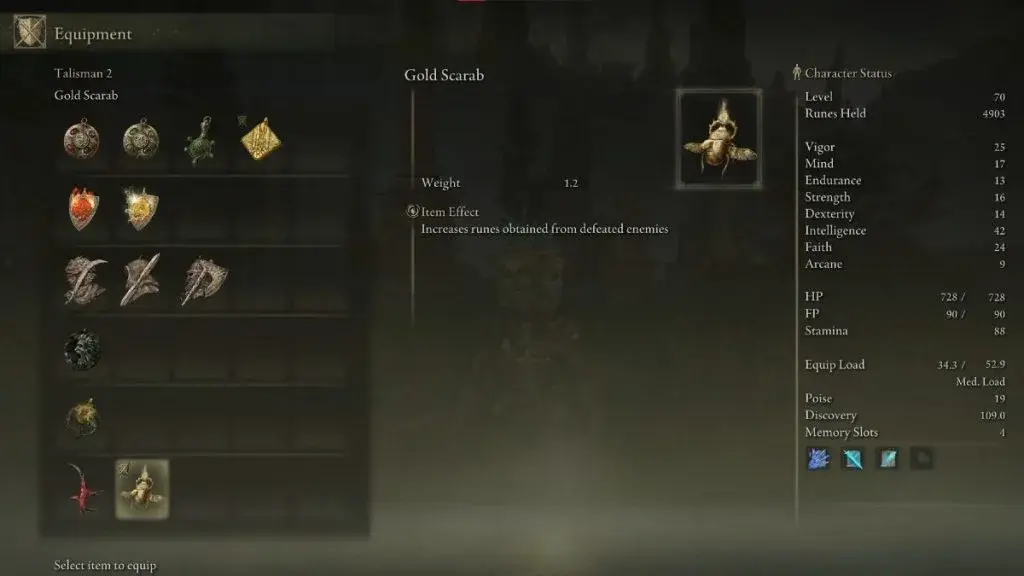 Gold Scarab은 Elden Ring의 전설적인 Talisman으로, 적을 물리칠 때 얻는 룬의 수를 증가시킵니다.