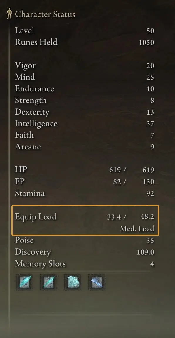 다른 항목에는 다른 무게가 있습니다. From Software(개발자)는 이 장비 로드 시스템을 사용하여 캐릭터가 더 현실적이고 물리적으로 느껴지도록 하므로 더 무거운 갑옷과 무장(예: 더 큰 검이나 방패)은 더 가벼운 갑옷과 무장보다 더 무겁습니다. 추가로 장비한 무기도 장비 부하에 포함되므로 현실적으로 사용할 수 있는 장비를 더 이상 장비하지 마십시오. 통계 페이지에서 각 항목의 무게를 확인할 수 있습니다.