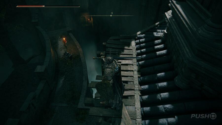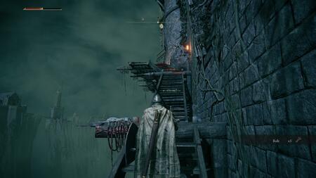 앞의 방에는 또 다른 순찰 중인 기사가 있습니다. 이제 선택이 있습니다. 룬 과 교환하여 그들을 잡고 죽 이거나 오른쪽 벽 너머의 나무 계단을 사용하여 외부를 확장하십시오. 무엇을 선택하든 나무 플랫폼 밖으로 나가서 끝에 있는 사다리를 오르고 싶을 것입니다.