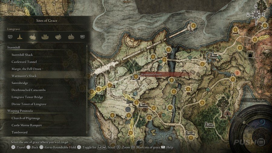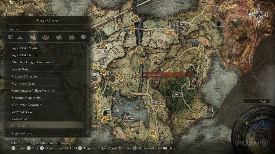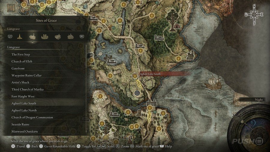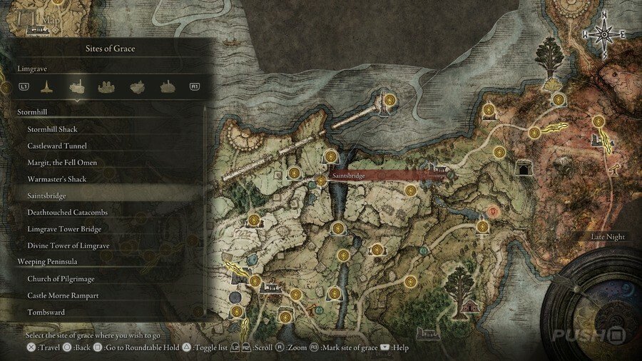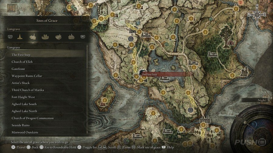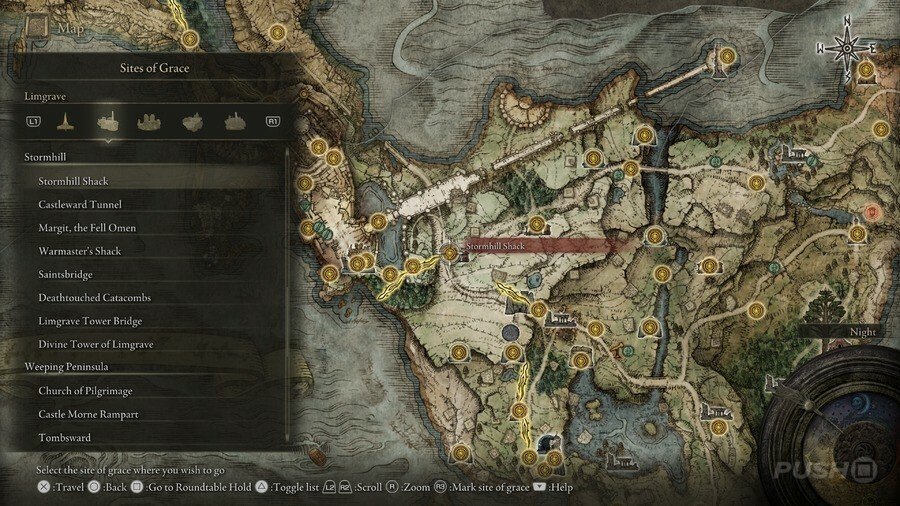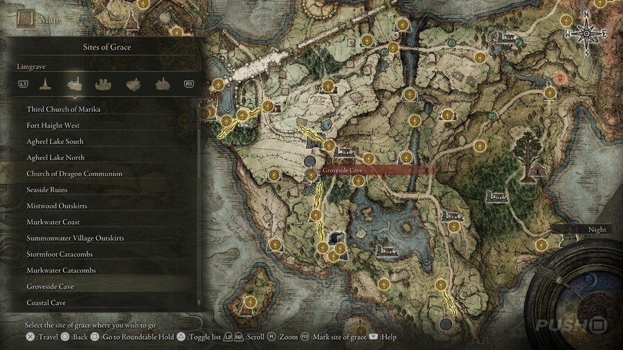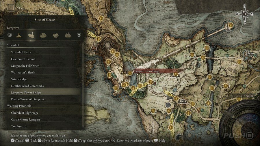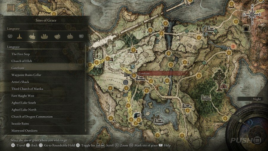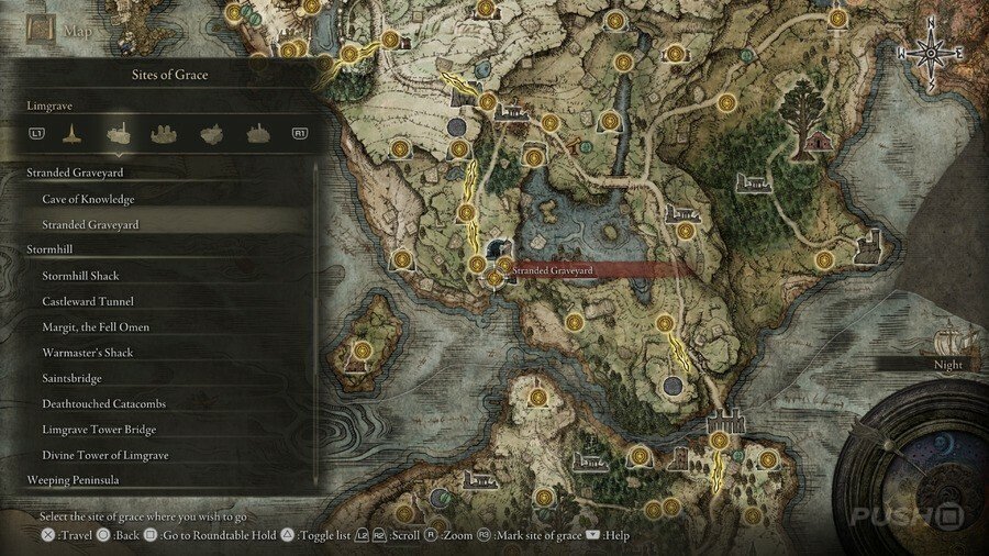 처음부터 당신은 Limgrave , Stormveil Castle , Weeping Peninsula , Caelid 의 은총 의 장소에만 접근할 수 있다는 점에 유의하십시오 . 다른 지역에서는 보스를 물리쳐야 액세스할 수 있습니다.