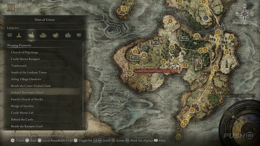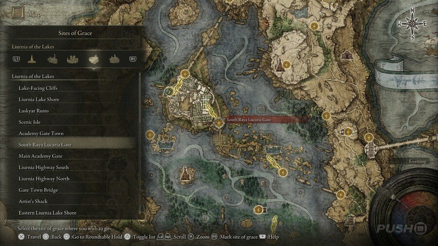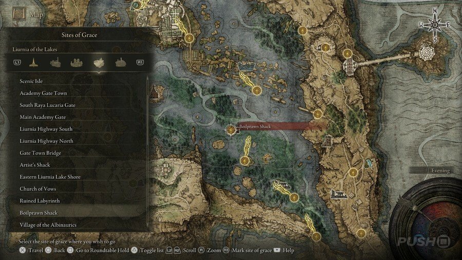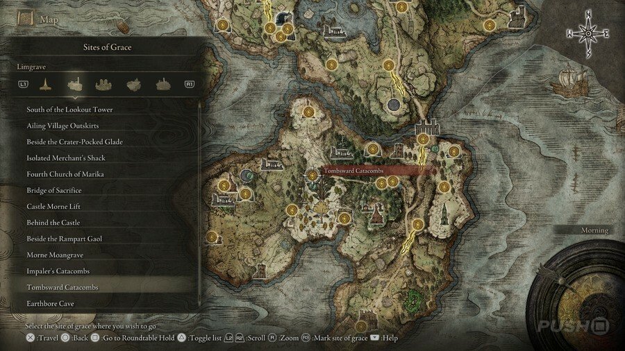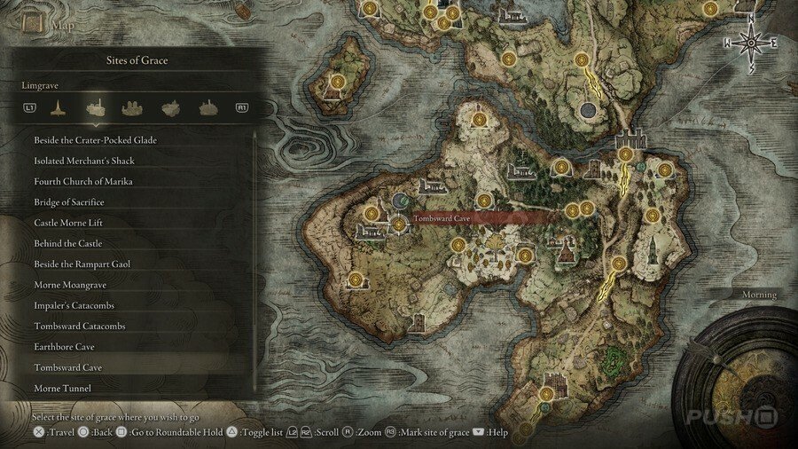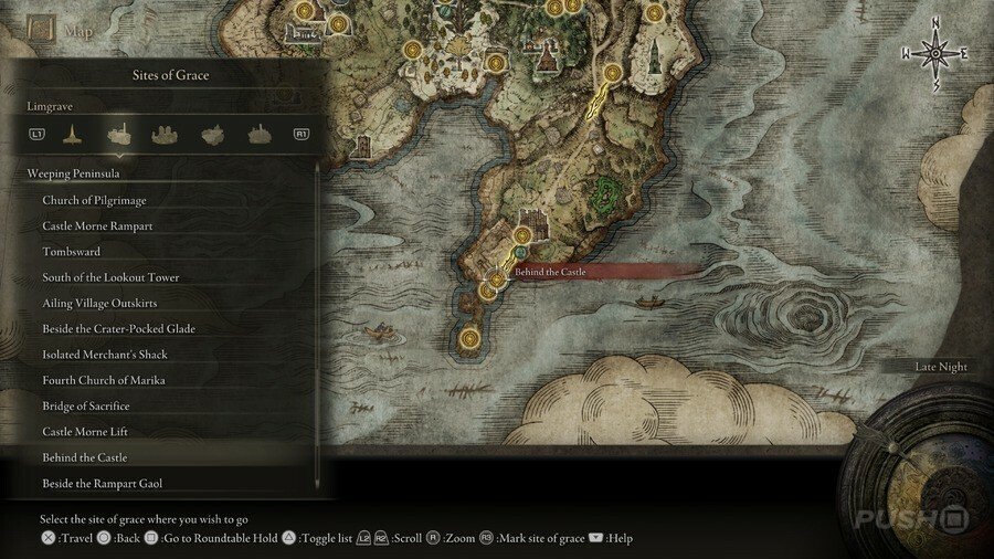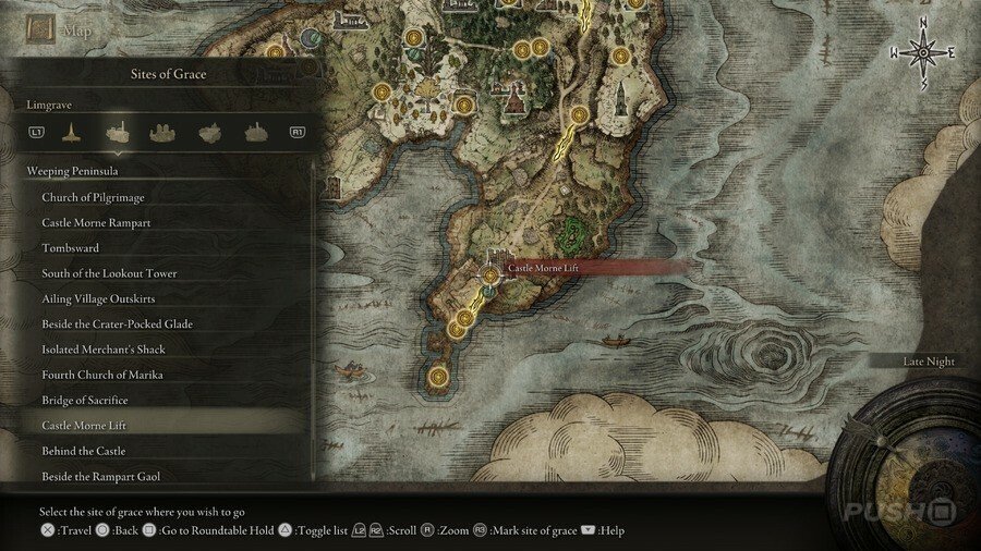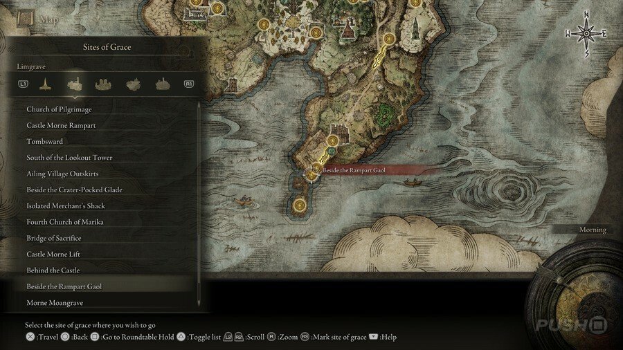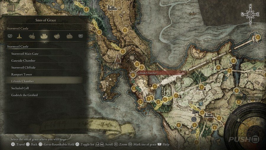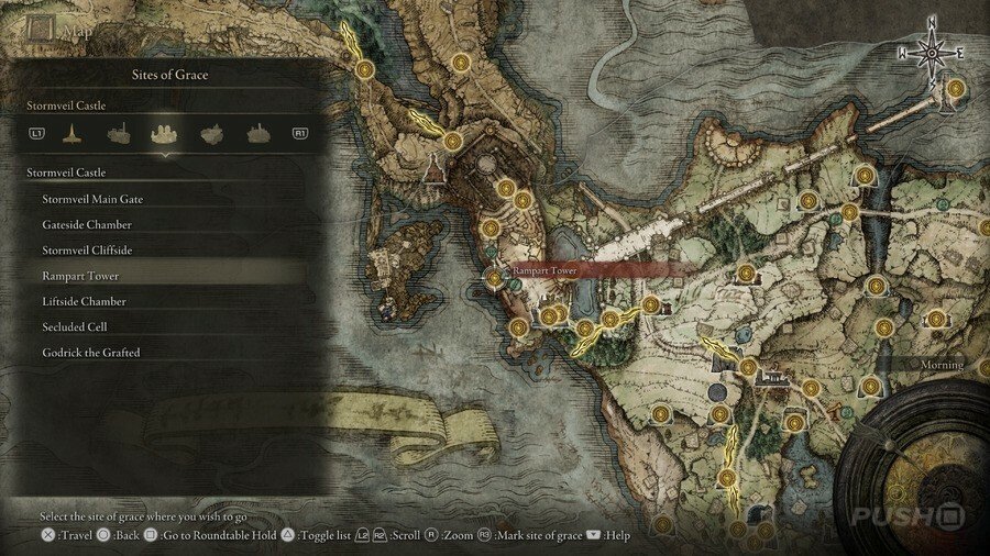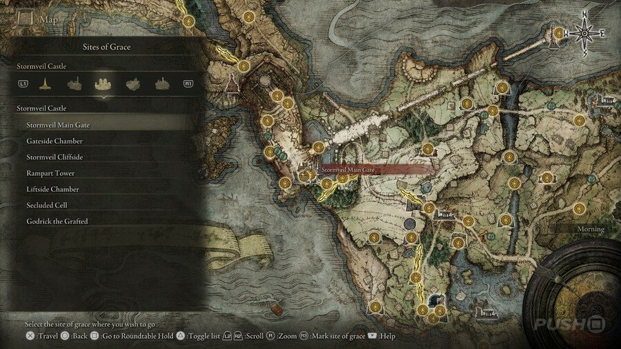 처음부터 당신은 Limgrave , Stormveil Castle , Weeping Peninsula , Caelid 의 은총 의 장소에만 접근할 수 있다는 점에 유의하십시오 . 다른 지역에서는 보스를 물리쳐야 액세스할 수 있습니다.