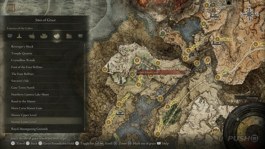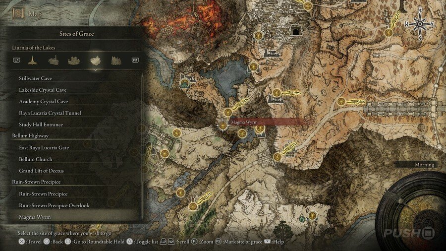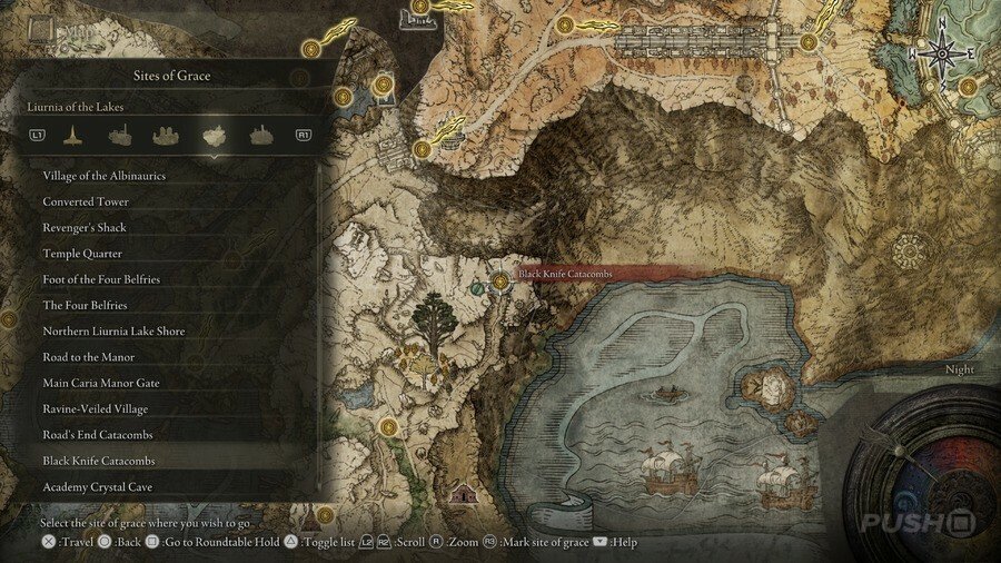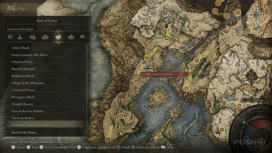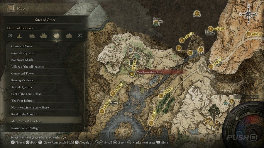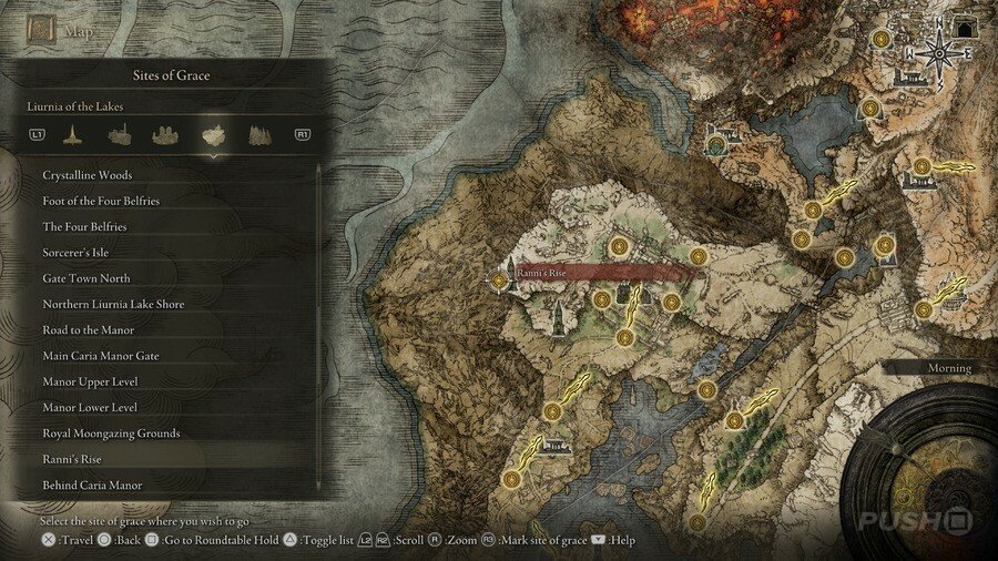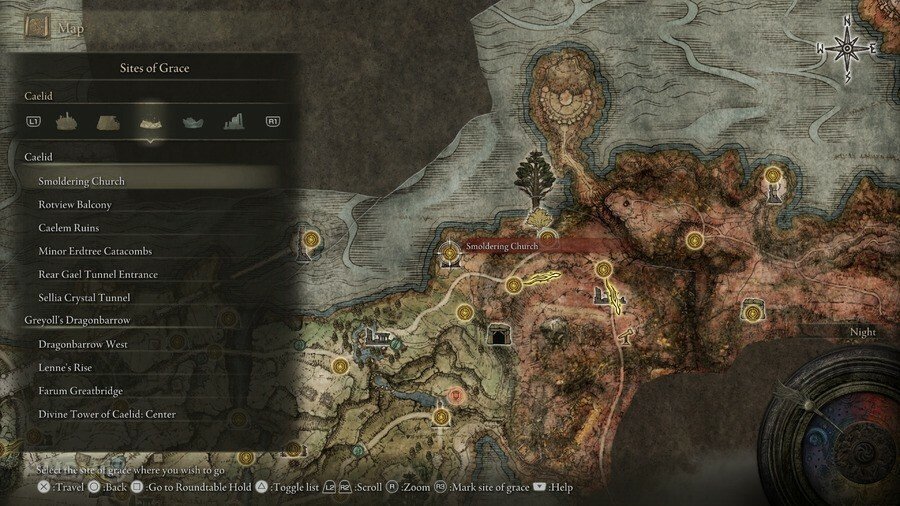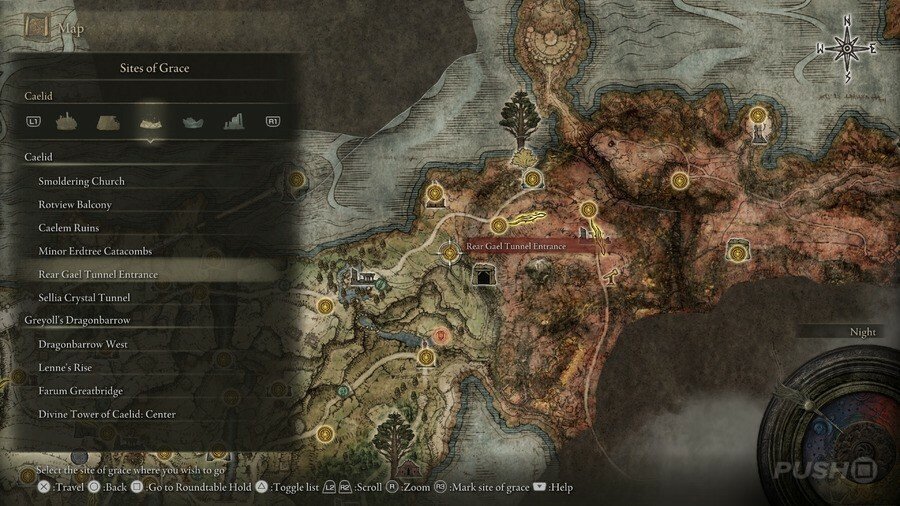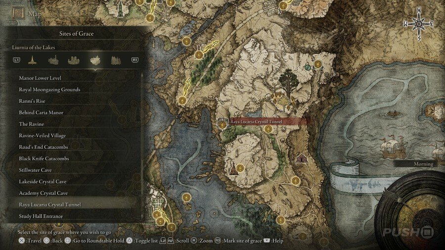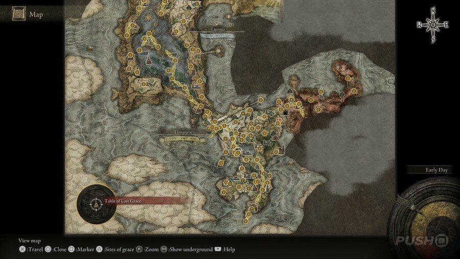 처음부터 당신은 Limgrave , Stormveil Castle , Weeping Peninsula , Caelid 의 은총 의 장소에만 접근할 수 있다는 점에 유의하십시오 . 다른 지역에서는 보스를 물리쳐야 액세스할 수 있습니다.