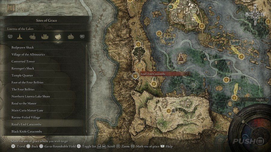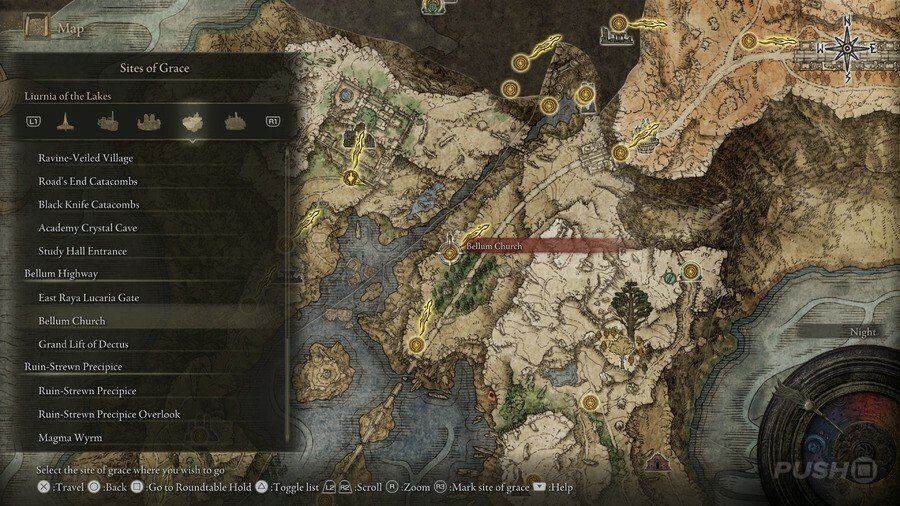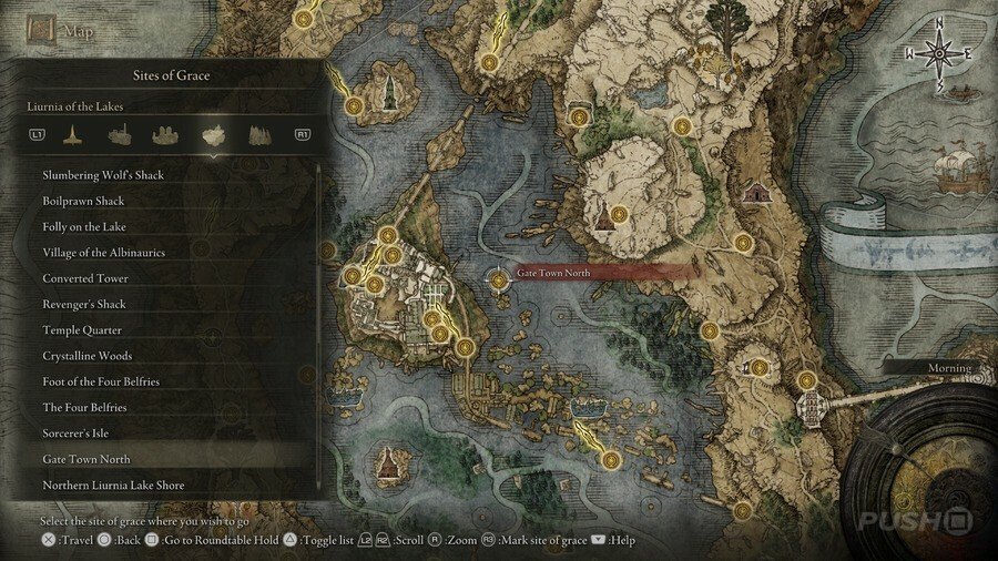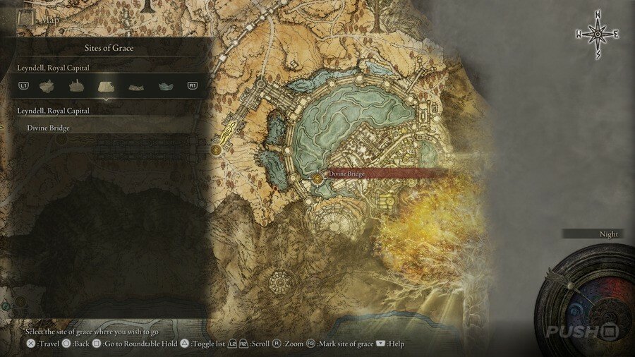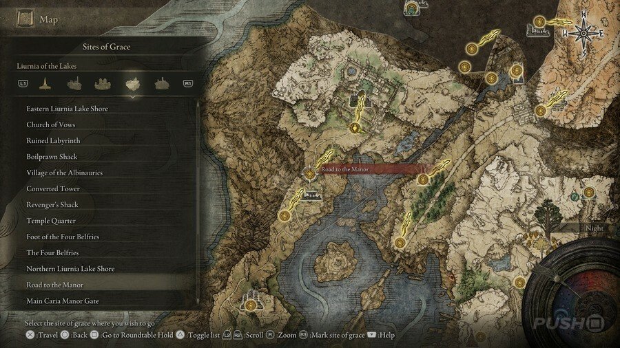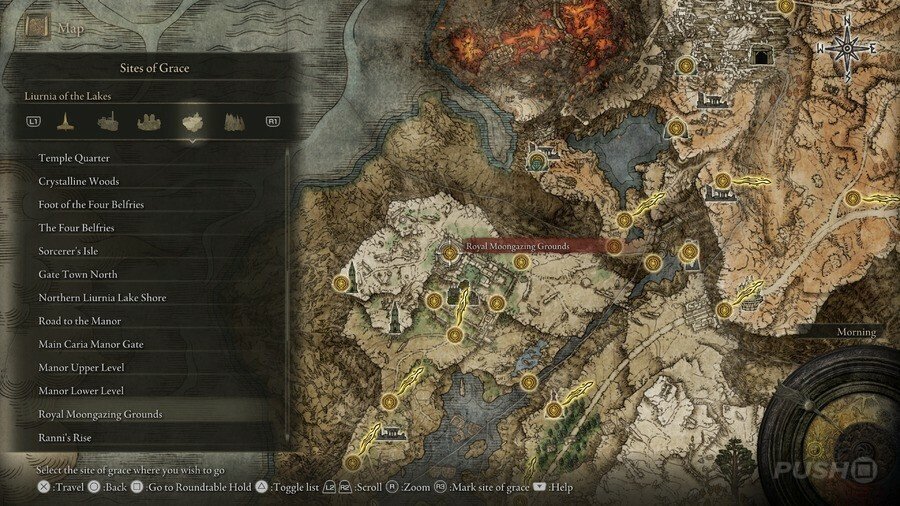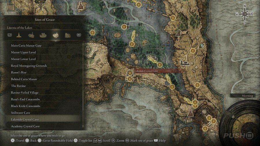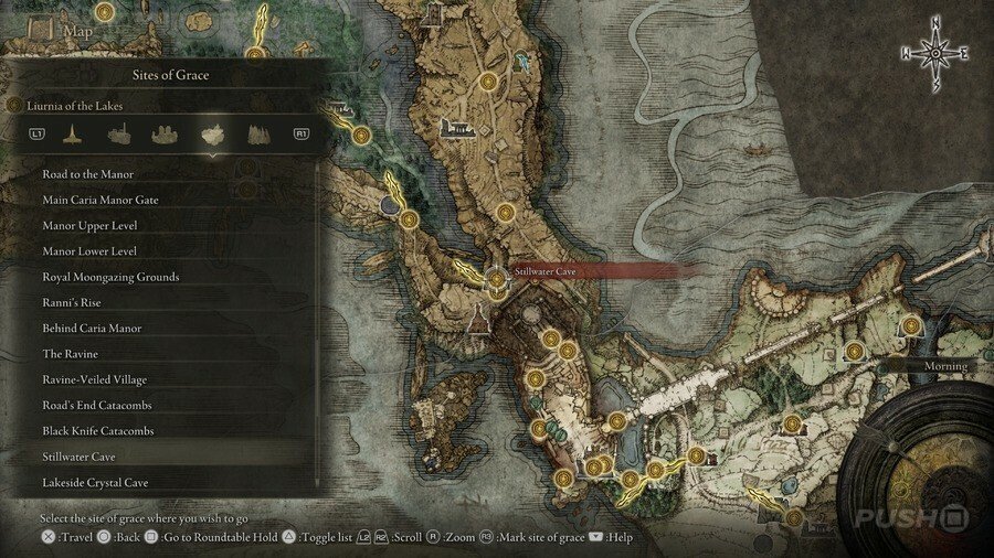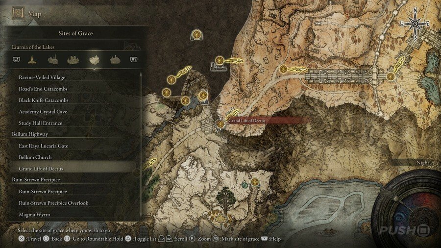 처음부터 당신은 Limgrave , Stormveil Castle , Weeping Peninsula , Caelid 의 은총 의 장소에만 접근할 수 있다는 점에 유의하십시오 . 다른 지역에서는 보스를 물리쳐야 액세스할 수 있습니다.