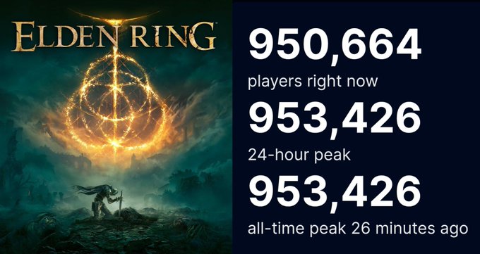 SteamDB 에 따르면 Elden Ring은 두 번째 주말에 953,426명의 새로운 동시 플레이어 수 기록을 세웠습니다. 이는 최고 913,634명을 기록한 Amazon의 MMO New World를 제치고 Elden Ring은 동시 플레이어 수 기준으로 Steam에서 6번째로 큰 게임이 되었으며 1,054,388명의 기록을 보유한 Cyberpunk 2077에 이어 싱글 플레이어 게임으로는 두 번째로 큰 게임이 되었습니다. 선수.