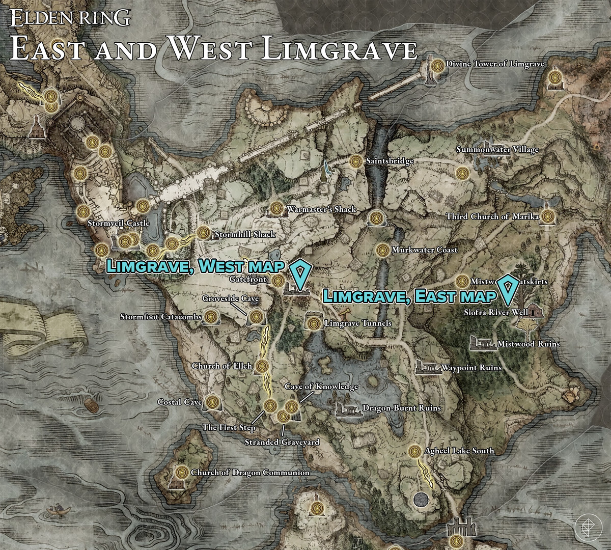 첫 번째 탐색 영역인 Limgrave 에는 두 개의 지도가 있습니다. Limgrave, East 및 Limgrave, West .
