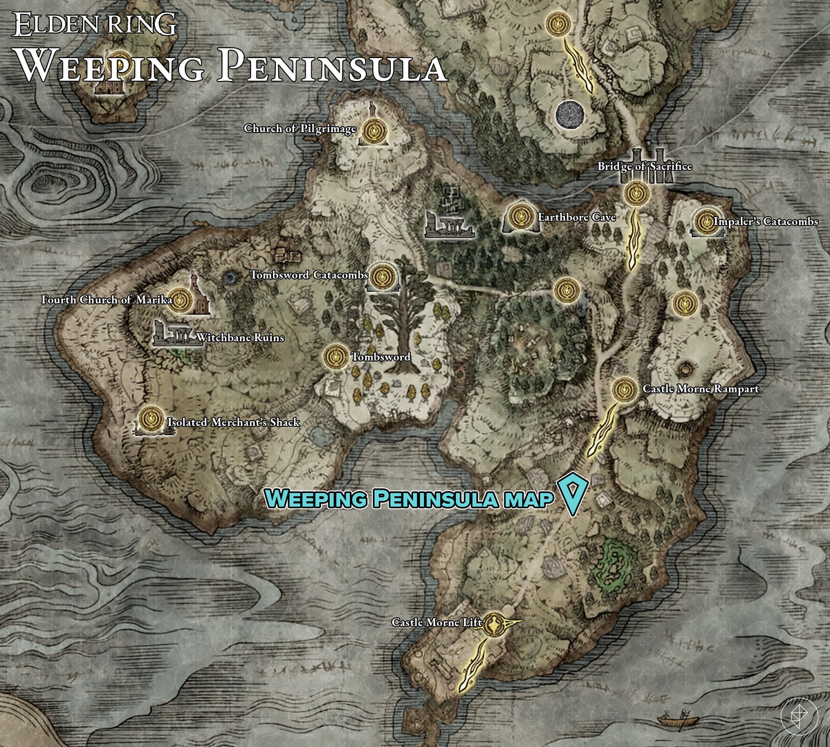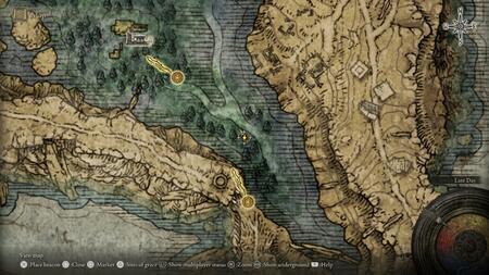 Limgrave 의 남쪽 에는 Weeping Peninsula 가 있으며 그것은 하나의 지도 조각입니다. (이것은 실제로 Limgrave의 일부일 수 있지만 이름이 다르기 때문에 고유한 섹션을 갖습니다.)