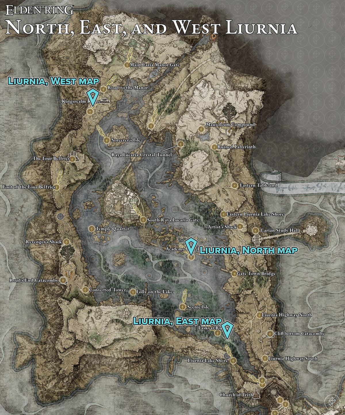 ELDEN RING EAST, WEST 및 NORTH LIURNIA 지도 조각 비석 위치