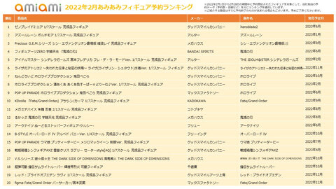 오오네는 이 회사 하비숍 '아미아미'의 2022년 2월 피규어 예약 랭킹을 발표했다.