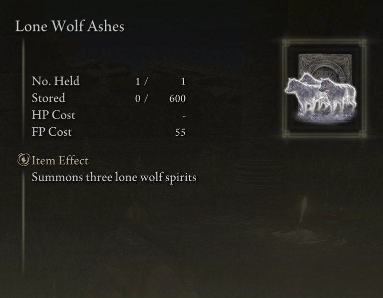 Renna는 당신에게 고독한 늑대 재를 무료로 줄 것입니다. 늑대 3마리를 소환할 수 있는 아이템입니다. 그들은 매우 사나우며 빠릅니다. 그들은 큰 건강 풀을 가지고 있지 않습니다 (업그레이드하지 않는 한, 그러나 그것은 다른 가이드의 주제입니다).