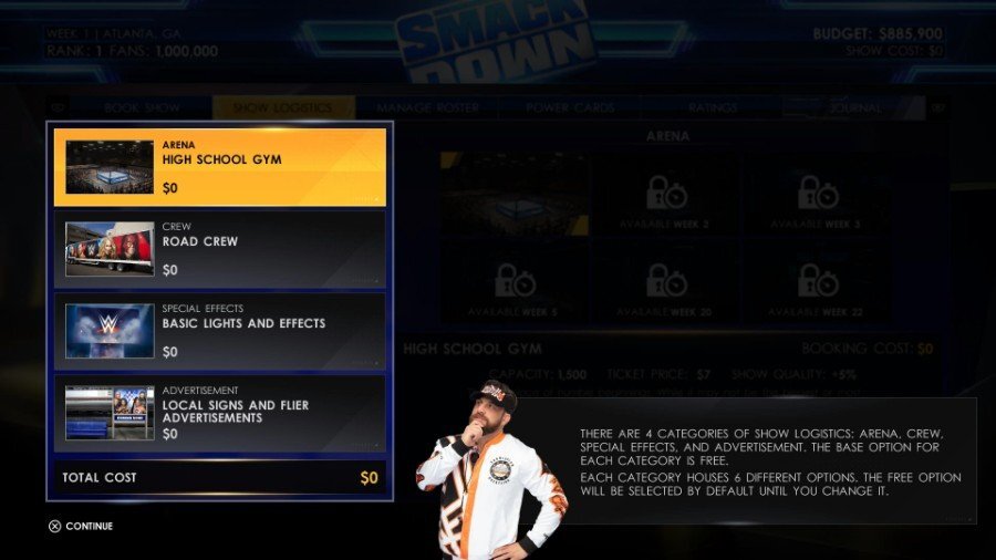 그런 다음 물류도 예약해야 합니다. 여기에는 특수 효과, 승무원, 광고 및 경기장이 포함됩니다. 특정 요구 사항을 충족하는 경우 각각에는 관련 비용과 선택적 부스트가 있습니다. 비용이 들지 않지만 긍정적인 수익이 거의 없는 각 범주의 기본부터 시작합니다. 다른 옵션은 몇 주 후에 열리며 대부분은 프로그램에 사용하는 데 돈을 쓰기 전에 잠금 해제를 위해 구매해야 합니다. 매주는 완전히 새로운 한 주이며 사용 가능한 예산에 따라 결정을 내려야 합니다.