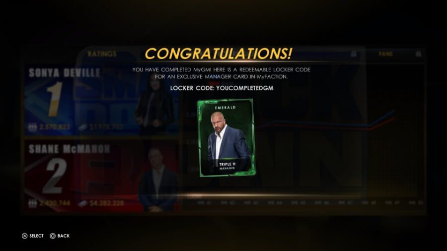 MyGM을 완료하고 우승하면 MyFaction에서 사용할 Triple H의 관리자 카드를 잠금 해제할 수 있는 보관함 코드를 받게 됩니다. MyFaction의 초기 단계에서 그는 아마도 최고의 관리자가 될 것입니다. 락커 코드는 YOUCOMPLETEDGM 으로 MyFaction 메뉴를 통해 입장할 수 있습니다.
