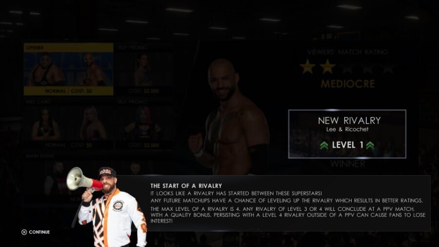 다른 두 가지 요인이 중요한 역할을 합니다. 경기 유형과 경쟁 수준 입니다. 레슬링 선수들이 서로 겨룰 때마다 그들은 레벨 1 라이벌 관계를 발전시킬 것입니다. 프로모션에서 콜아웃 기능을 사용하여 불화를 시작할 수도 있지만 이는 전적으로 사용자가 제어할 수 없는 프로모션의 품질에 달려 있습니다. 각 레슬러는 1에서 5까지의 프로모션 등급이 있으며 숫자가 높을수록 좋습니다. 다시 말하지만, 콜아웃을 사용하여 가능한 한 경쟁을 시작 하고 레벨 2로 올리 십시오 .