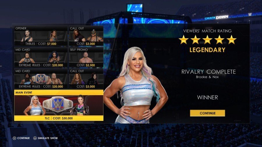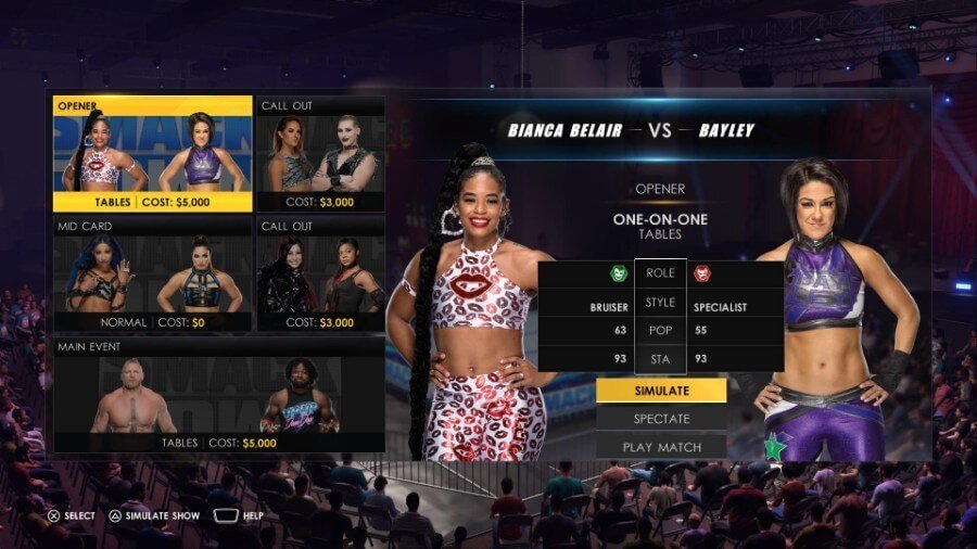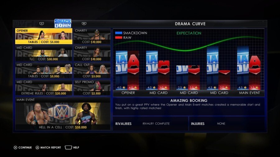 일치 유형은 다른 주요 요소입니다. 일반 싱글이나 태그 팀 매치도 괜찮지만 알고리즘이 실제로 게임을 예약하는 것은 기믹과 타이틀 매치, 특수 효과 타이틀 매치가 훨씬 더 좋습니다 . 유일한 문제는 각 기믹 매치 에 점점 더 많은 돈이 든다는 것 입니다. 테이블 경기는 더 비싼 Extreme Rules, TLC 및 Hell in Cell 경기를 통해 가장 저렴합니다.