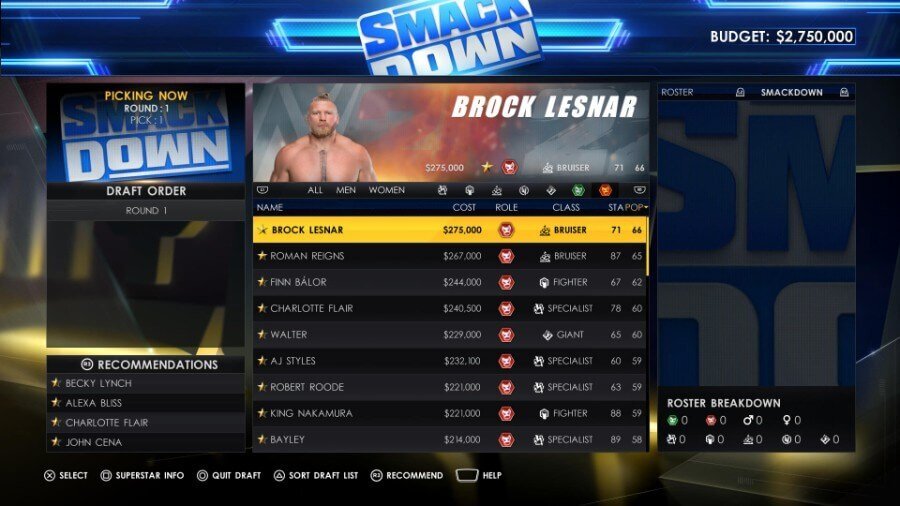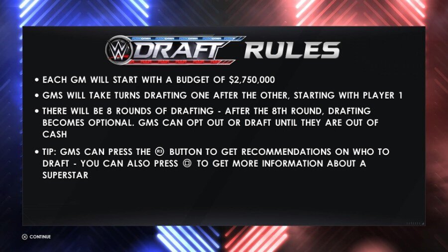 드래프트는 8 라운드 입니다. 8라운드 이후에는 275만 달러의 할당된 풀로 드래프트를 계속할 수 있습니다. 각 레슬러는 고려해야 할 가격, 스타일, 정렬, 체력 및 인기가 있습니다. 운 좋게도 선택한 쇼에 관계없이 항상 첫 번째 선택을 받고 대체 선택을 받게 됩니다. 즉, 항상 각 라운드의 첫 번째 선택 항목이 있습니다.