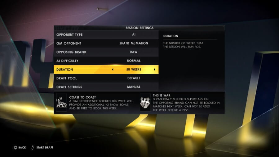 MyGM에서는 특정 시간 후에 누가 가장 많은 팬을 확보할 수 있는지 보기 위해 다른 GM(및 쇼)과 겨루게 됩니다 . 이전 GM 모드에서는 WrestleMania 로 끝나는 1년이 넘었습니다 . My GM에서는 가장 짧은 시즌 15주와 가장 긴 50주가 있는 몇 가지 선택을 할 수 있으며 다시 WrestleMania 로 끝납니다 .