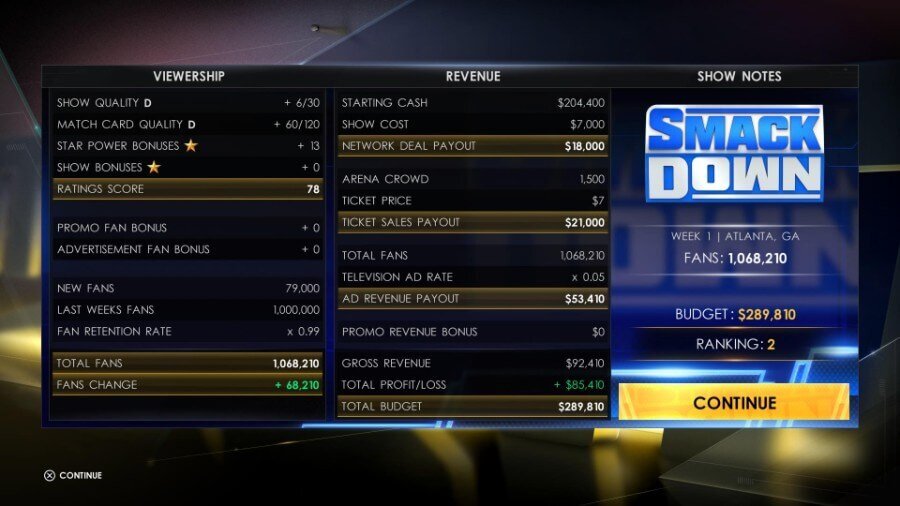 사용 가능한 레슬러 명단을 작성하고 자유 계약 선수와 계약할 수 있습니다. 당신의 임무는 가장 많은 시청자를 확보하기 위해 매주 최고의 경기를 펼치는 것입니다. 경기 예약 외에도 도움이 되는 다른 메커니즘이 있지만(자세한 내용은 아래 참조) 팬을 끌어들이는 주요 방법은 흥미진진한 경기를 예약하는 것입니다.