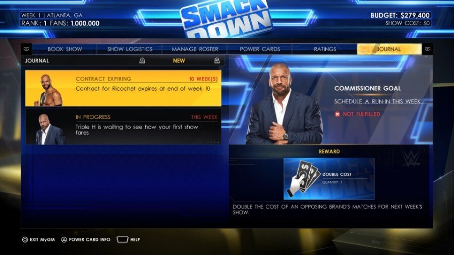 마지막 쇼를 제외하고 Triple H의 저널에 주간 커미셔너의 목표가 있습니다. 여기에는 런 인 일정 잡기, 테이블 매치, 가장 인기 있는 얼굴을 가장 인기 있는 힐에 맞추는 것 등 무엇이든 될 수 있습니다. 이러한 작업을 수행하는 데 대한 보상은 파워 카드 (아래에 자세히 설명되어 있음)이므로 보상이 특히 무료 물류 비용 카드인 경우 가치가 있습니다.