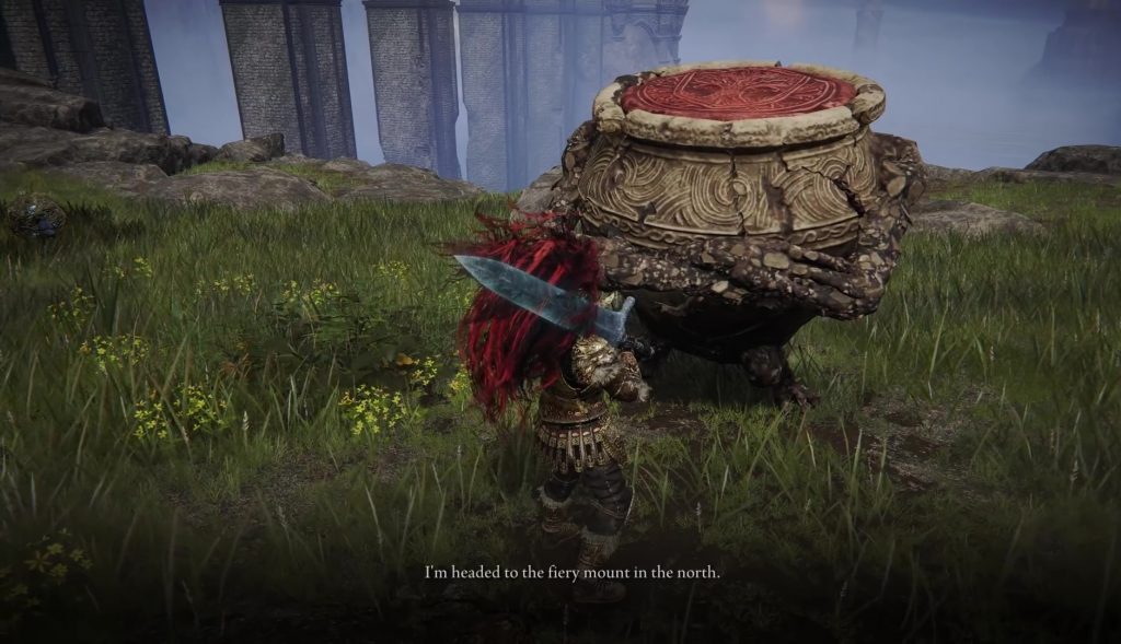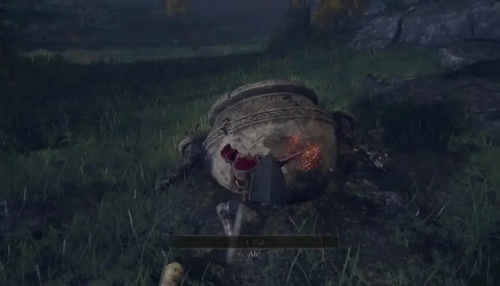 아래 표시된 위치에서 Liurnia 의 Artist's Shack 남쪽에 있는 Alexander를 찾을 수 있습니다. Artist's Shack Site of Grace 에서 남쪽으로 이동하여 표시된 위치에 도달합니다. 알렉산더가 구덩이에 갇힌 것을 다시 보게 될 것입니다. 이번에는 단순히 때리는 것만으로는 그를 풀어줄 수 없습니다. 알렉산더에게 기름병 몇 개를 던져 윤활제를 바르십시오. 그런 다음 그를 풀어주기 위해 뒤에서 그를 때립니다. 그런 다음 모든 대화 옵션이 소진될 때까지 그와 대화하십시오.