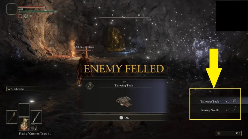 동굴 안으로 들어가서 반인간 족장을 처치하십시오. 그것은 재봉 도구와 재봉 바늘을 떨어 뜨릴 것입니다. Boc에게 재봉 바늘을 주십시오.