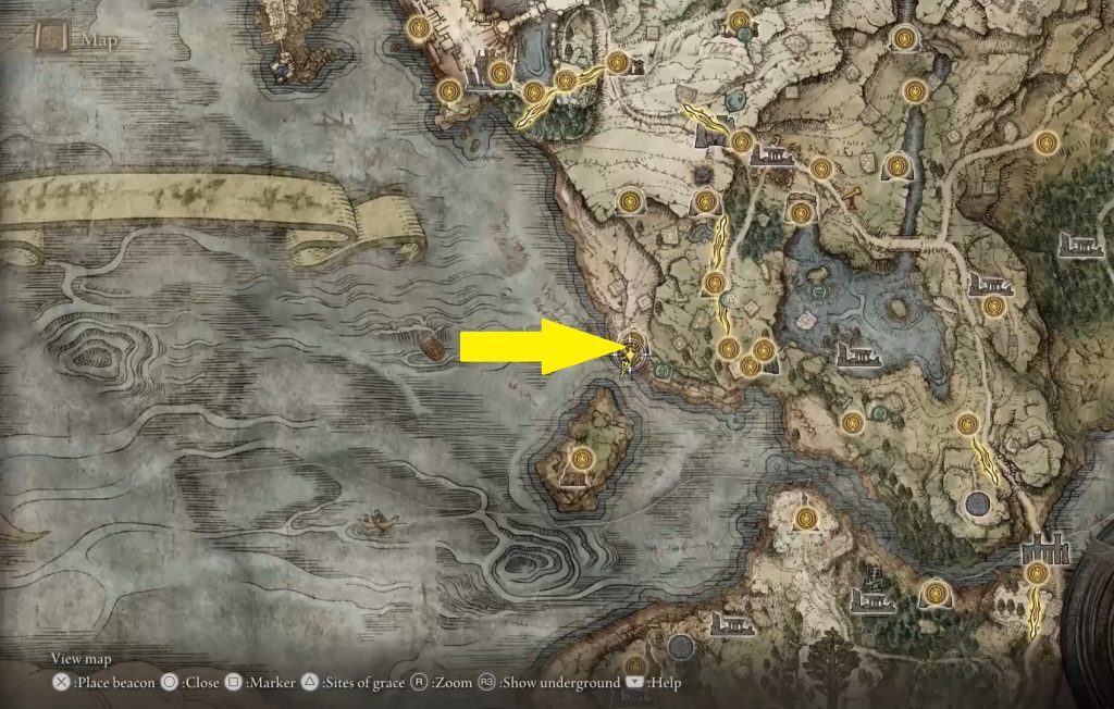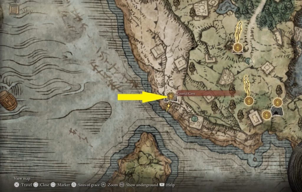 Boc이 있는 동굴은 아래 사진과 같이 Limgrave 지역의 서쪽 해변에 있습니다. 동굴의 이름은 "해안 동굴"입니다. Coastal Cave에 들어가 아래에 있는 Boc과 대화하십시오.