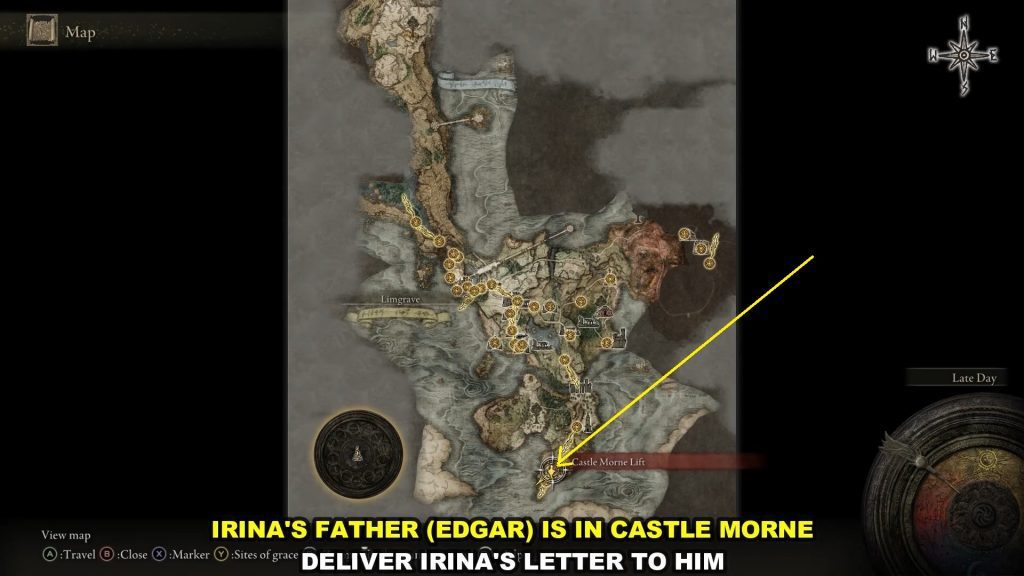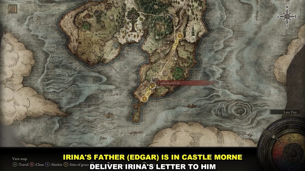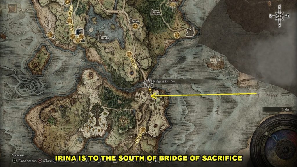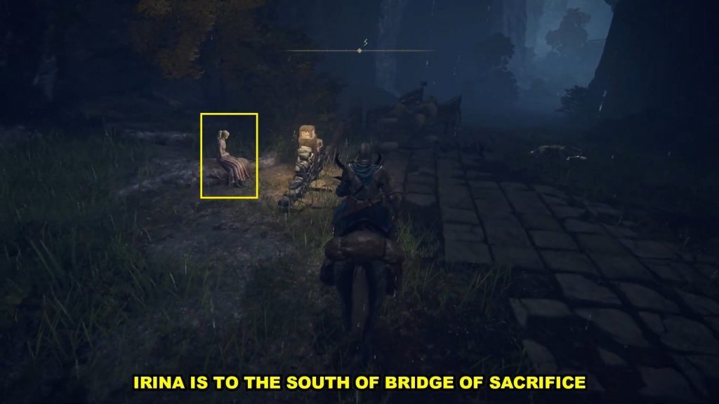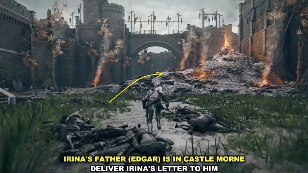 위핑반도 의 희생의 다리 남쪽 에 있는 이리나는 아래 사진과 같은 위치에 있습니다. 그녀는 당신에게 편지를 주고 Castle Morne 에 있는 그녀의 아버지에게 그것을 전달해 달라고 요청할 것 입니다.