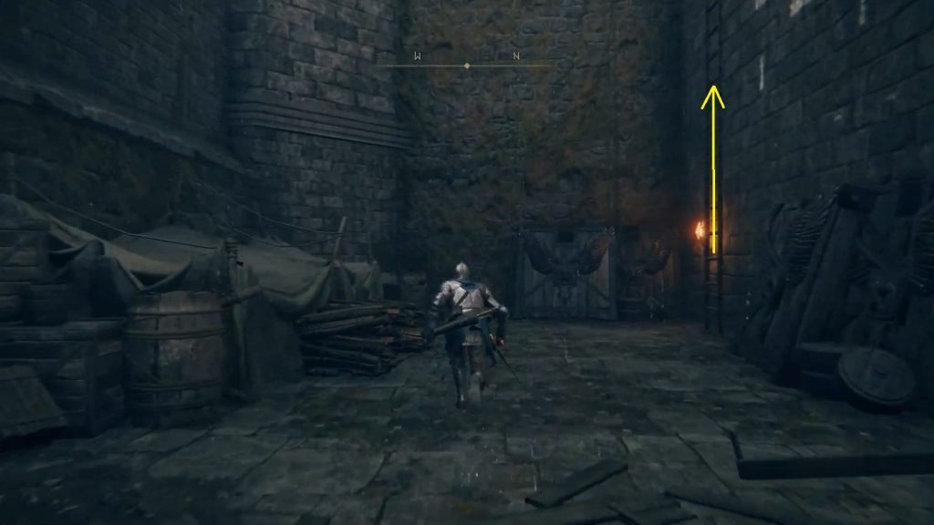 정문을 통해 성으로 들어가 직진합니다. 아래와 같이 길이 끝나면 우회전하세요. 우회전 후 직진하여 아래 두 번째 사진과 같이 길 끝에 있는 사다리를 타고 올라갑니다.