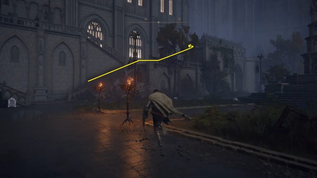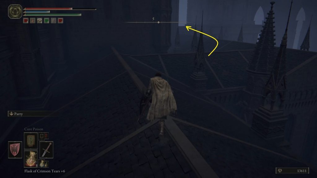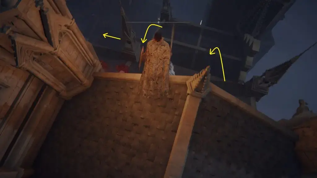 거기에서 아래의 지붕으로 뛰어내립니다. 그런 다음 아래 그림과 같이 타워에 도달할 때까지 지붕에서 남쪽으로 계속 걸어갑니다.