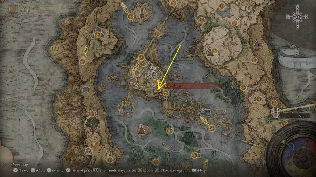 아래 사진에 표시된 위치에서 Liurnia에 있는 Irith 교회에서 Thops를 찾을 수 있습니다.