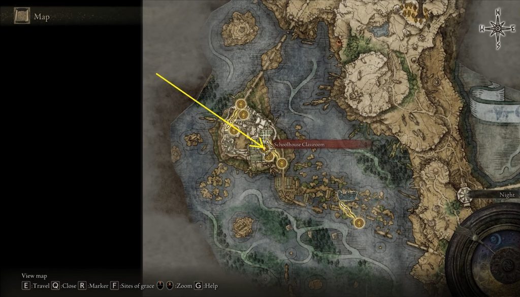 은총의 학원 아카데미 현장 옆 문을 통해 건물 밖으로 나갑니다. 여기에서 Thops의 시체를 찾을 수 있습니다. 시체에서 3가지 아이템을 얻을 수 있습니다: Thop's Bearing Bell , Academy Glintstone Staff , & Thops's Barrier spell.