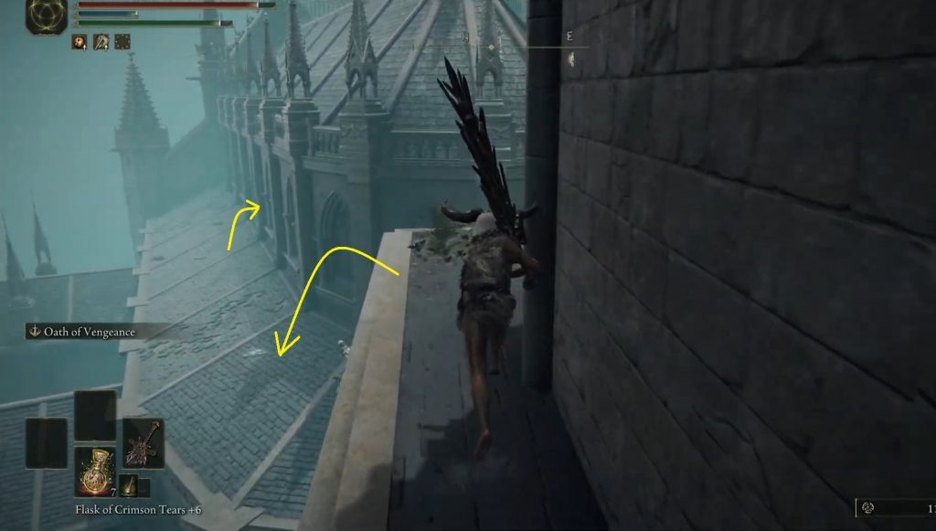 아래 지붕으로 뛰어내립니다. 이 지붕의 오른쪽으로 이동하여 아래 그림과 같이 아래의 난간으로 뛰어내립니다.