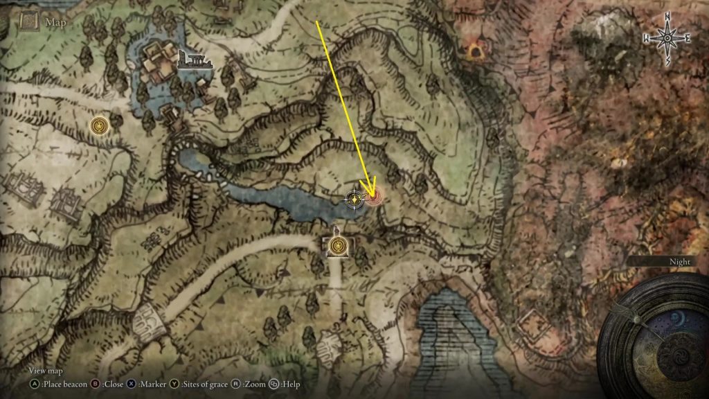 D는 아래 그림과 같이 Summonwater Village 의 남동쪽 지도에서 순간 이동된 위치를 표시합니다. 텔레포트된 위치로 이동하면 Caelid 의 야수 성소 로 텔레포트 됩니다. 순간이동은 일부 덤불 뒤에 숨겨져 있으므로 주의 깊게 찾아 찾으십시오.