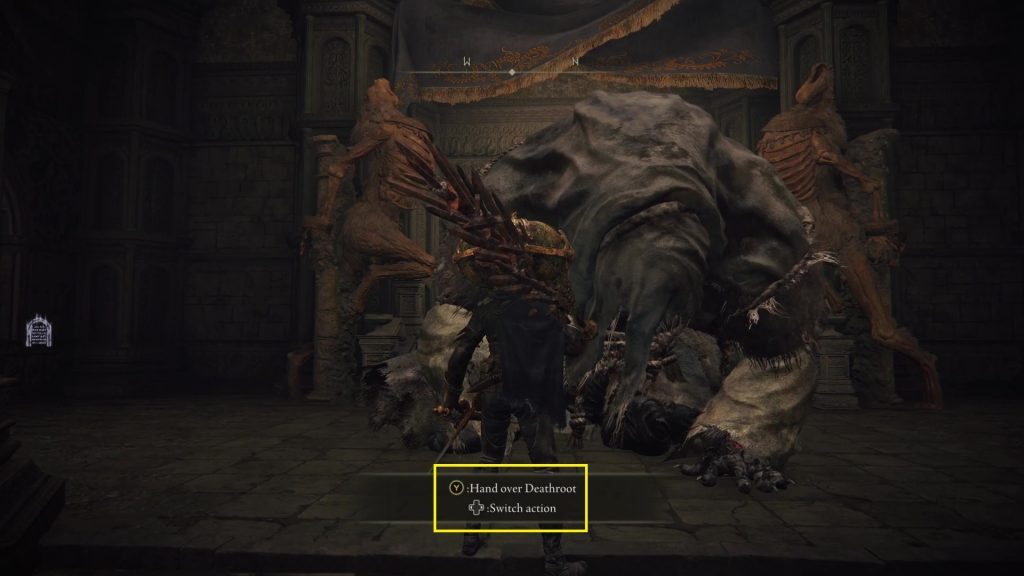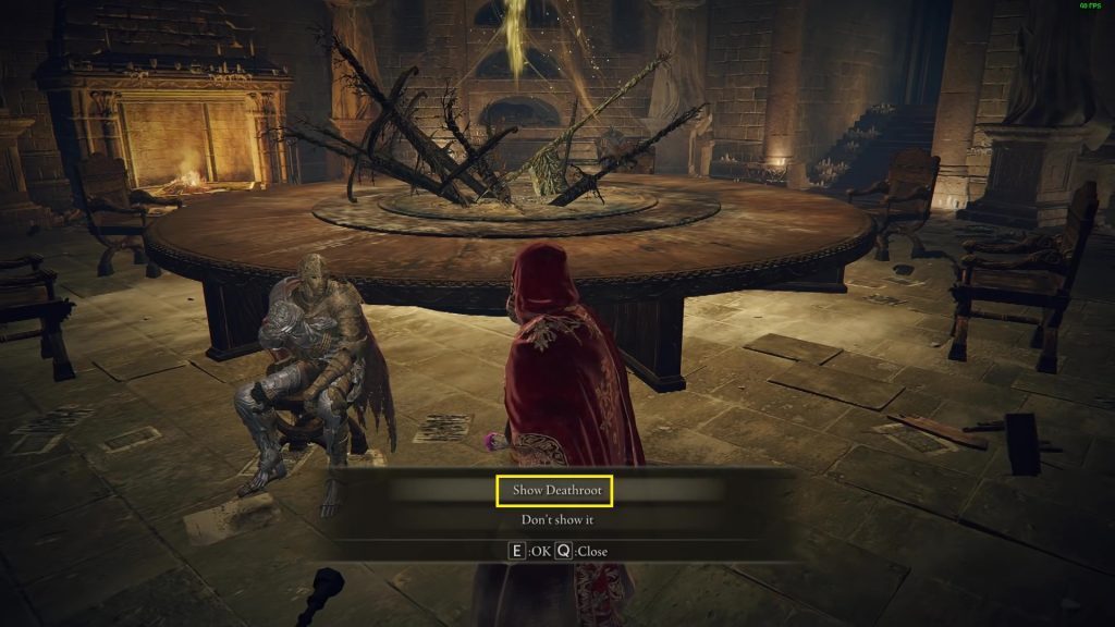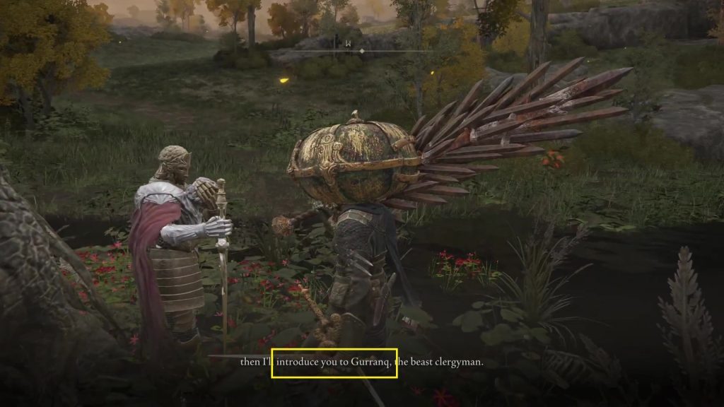 Tibia Mariner 를 처치한 후 Summonwater Village 의 서쪽 부분에 서 있을 D와 대화하십시오 . 그곳에서 그를 찾을 수 없다면, 아래 사진과 같이 원탁 회의장 에서 나중에 그와 대화할 수 있습니다. 그에게 데스루트를 보여 주면 야수 성직자 구랑크 의 위치를 알려줄 것 입니다.