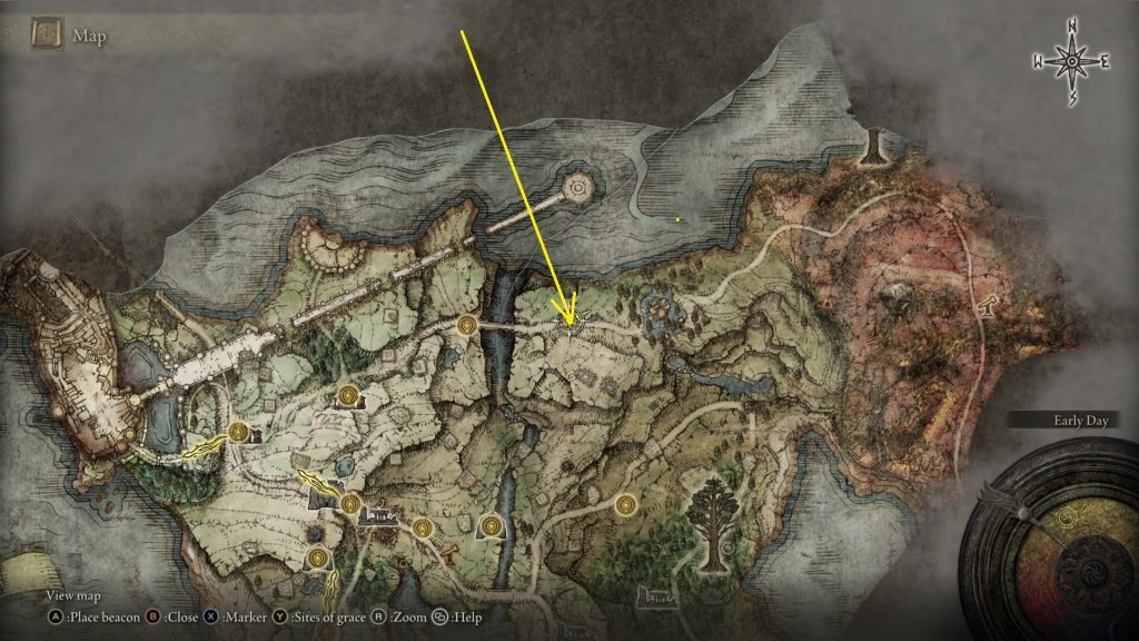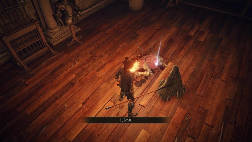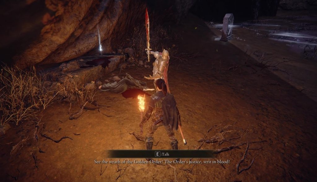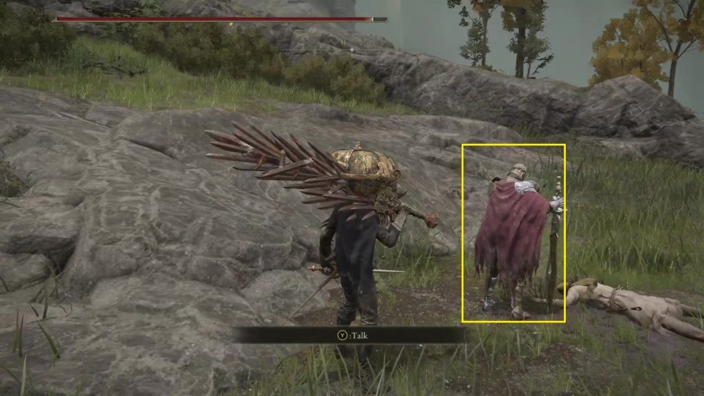 D를 처음 만나는 곳은 아래 사진과 같이 Limgrave의 Saintsbridge 동쪽입니다. 여기에서 당신은 그가 시체 옆에 서 있는 것을 발견할 것입니다. 그에게 말을 걸면 그는 언데드들이 들끓는 마을 앞에 가지 말라고 경고할 것입니다.