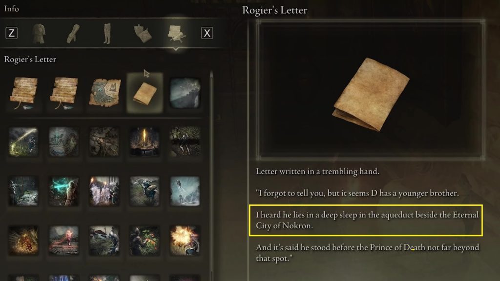 Rogier에게 가서 당신도 그를 발견할 것입니다. 나중에 돌아와서 Rogier의 편지 와 Spellblade의 갑옷 세트 를 그의 몸에서 얻을 수 있습니다. 편지에서 Rogier는 Nokron Eternal City 옆에 있는 수로에 있는 D에게 남동생이 있다고 말할 것입니다 .