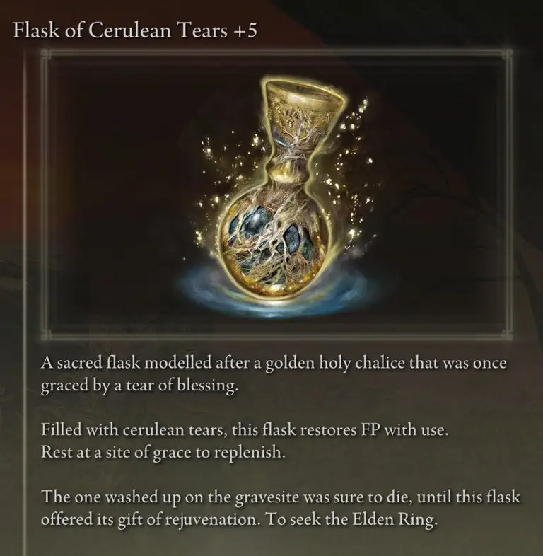 Crimson and Cerulean Flasks of Tears에서 음료를 마시면 HP와 FP를 회복할 수 있습니다. Crimson Flasks는 HP를 재생하고 Cerulean Flasks는 FP를 재생합니다.