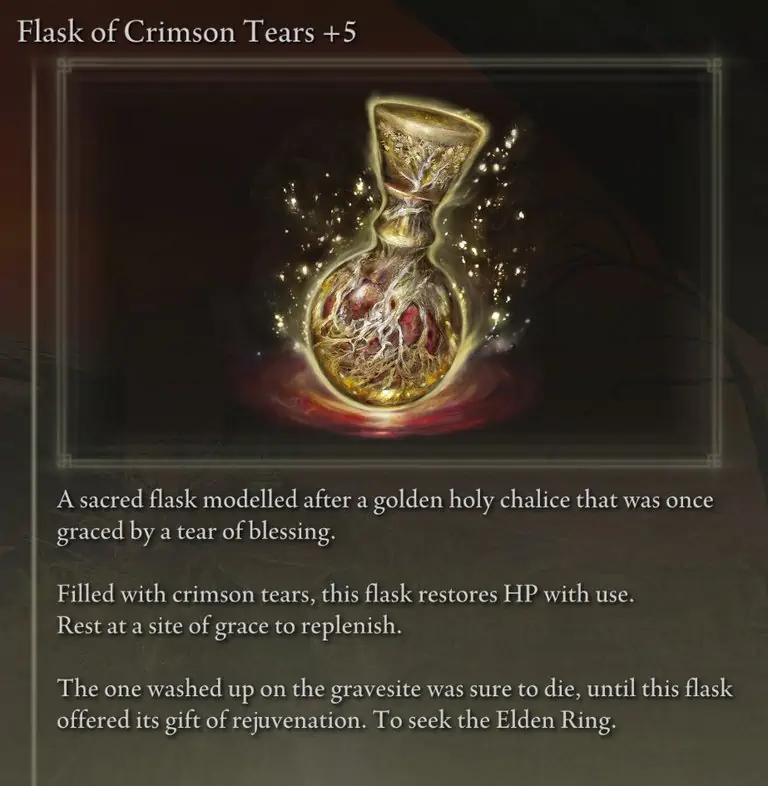 신성한 눈물은 플라스크의 각 모금에 의해 제공되는 재생을 업그레이드하기 위해 잃어버린 은혜에서 사용할 수 있습니다. 황금 씨앗과 달리 신성한 눈물 하나당 플라스크에서 재생되는 양이 증가합니다.