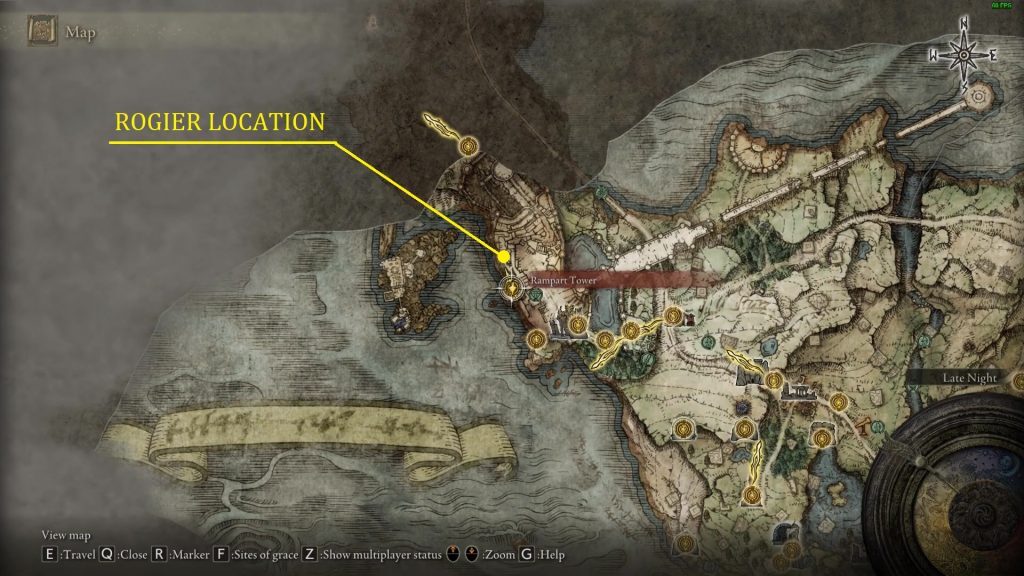 은총 의 성루 타워 사이트에서 북쪽 문으로 나가십시오. 동쪽의 벽으로 뛰어내립니다. 그런 다음 북쪽으로 향하는 벽으로 더 아래로 뛰어내립니다. 이 경로를 따라 이동하여 전방의 타워로 진입합니다. 그런 다음 좌회전하여 예배당으로 들어갑니다. 여기에서 제단 옆에 로지에가 있습니다. 이미 지역 보스인 Godrick을 죽였다면 그는 거기에 없을 것입니다. Rogier는 당신에게 마법 주문을 판매할 것입니다.