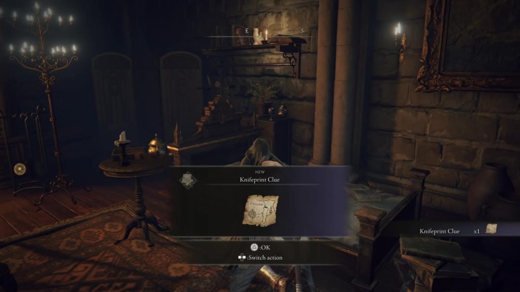 원탁 회의장에 있는 Fia와 대화하십시오 . 그녀가 당신을 붙잡고 그녀의 모든 대화 옵션을 소진하게하십시오. 그녀는 Black Knife Assassin 의 위치를 알려 줄 Knifeprint Clue 를 줄 것 입니다.