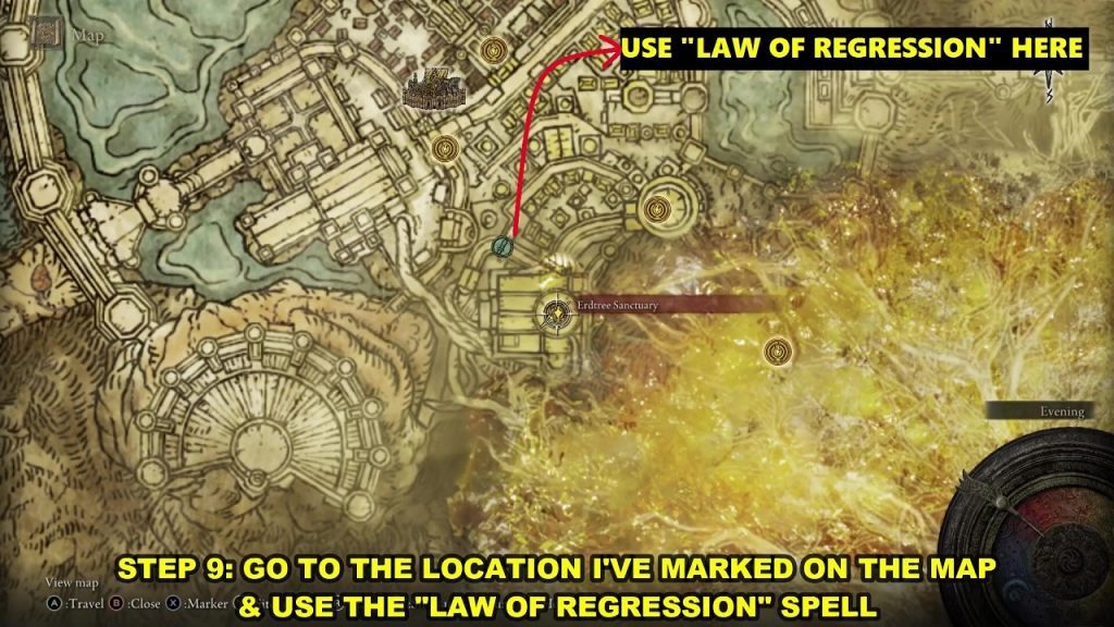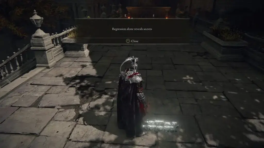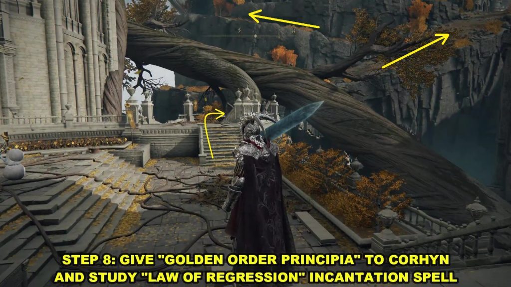 Erdtree Sanctuary Site of Grace에서 서쪽 문으로 나가십시오. 그런 다음 우회전하여 엘리베이터를 타십시오. 엘리베이터가 멈추면 계단을 따라 내려가면 표시된 위치에 도달합니다. 여기에서 "회귀만으로도 비밀이 드러납니다. 이 지점에서 회귀의 법칙 마법을 사용하십시오 .