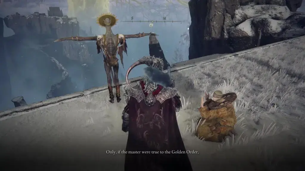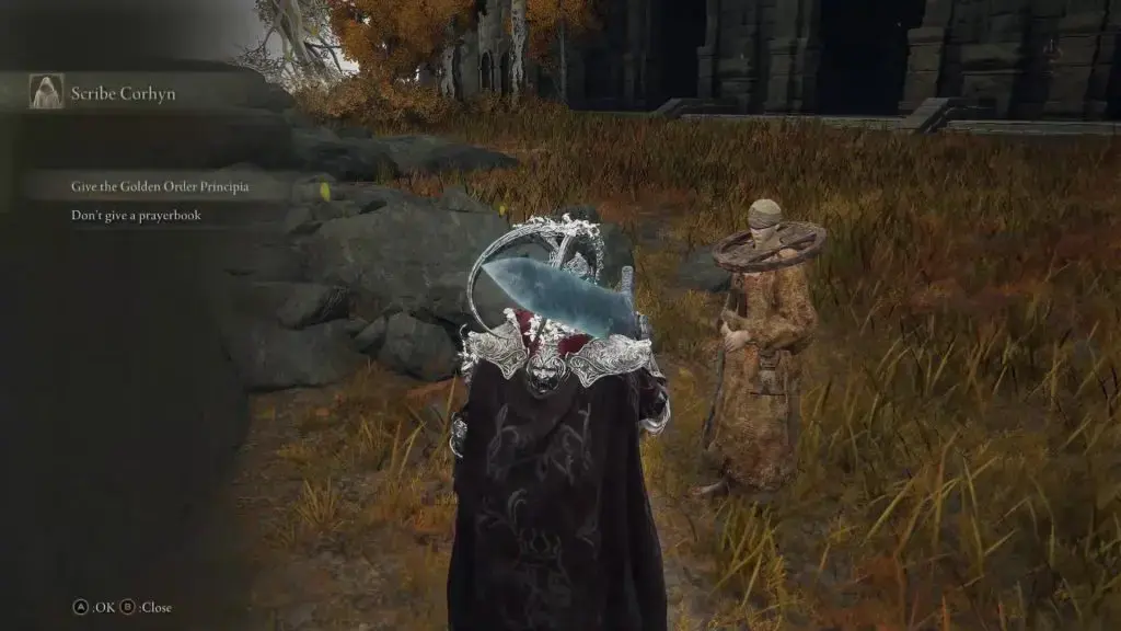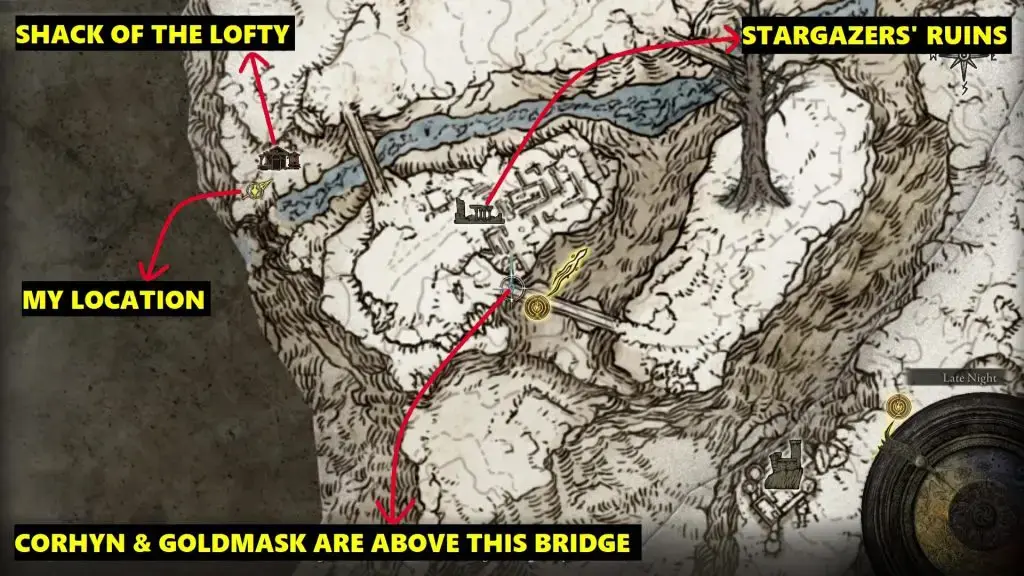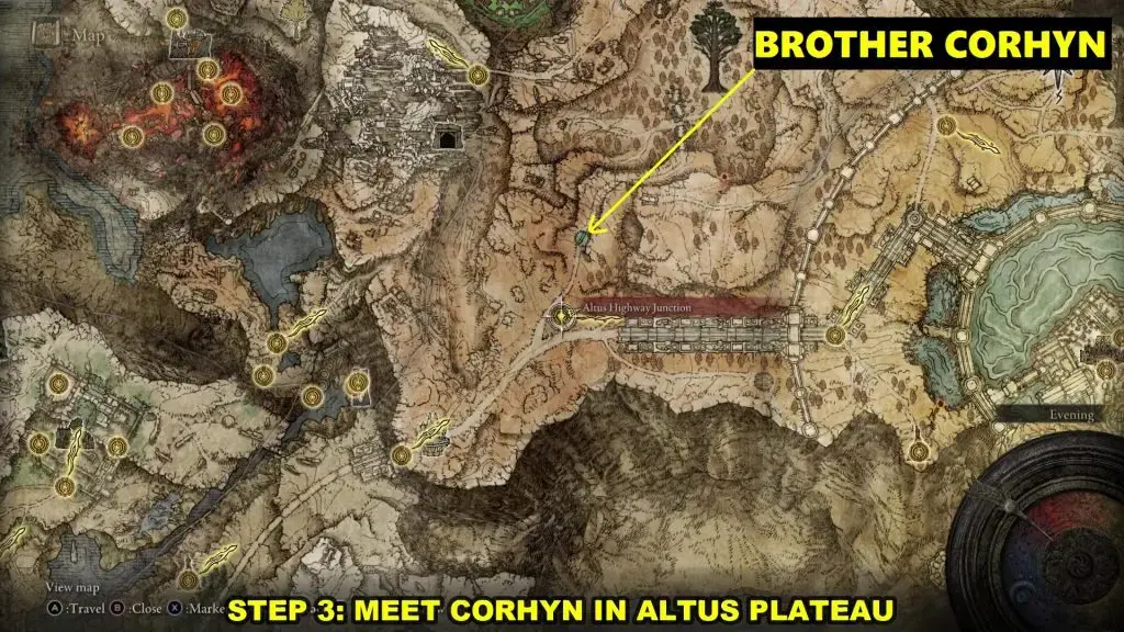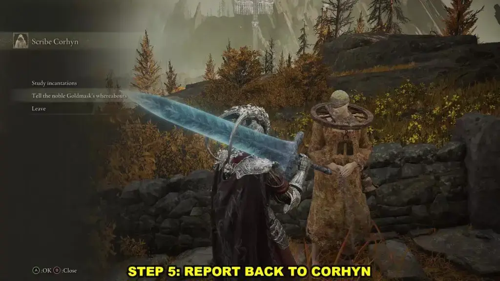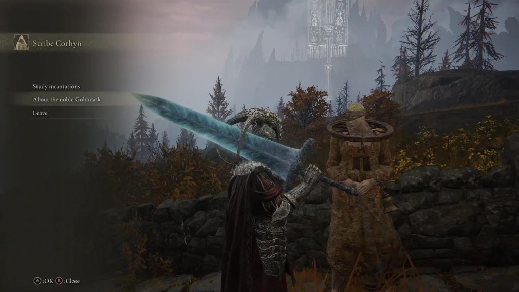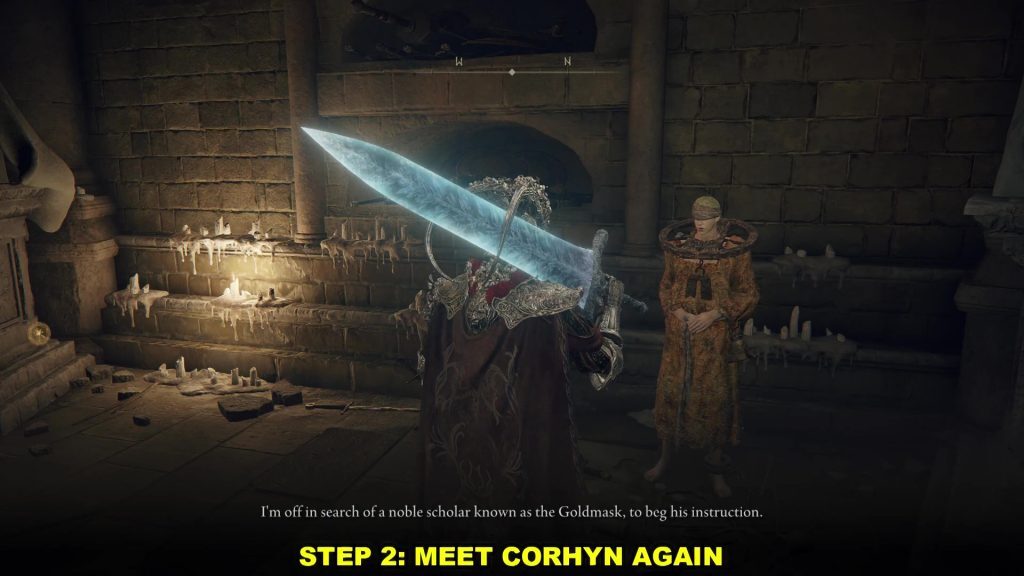 아래 사진과 같은 위치에서 Altus Plateau의 Altus Highway Junction 북쪽에 있는 Corhyn을 찾으십시오. 그에게 고귀한 Goldmask에 대해 이야기하십시오.