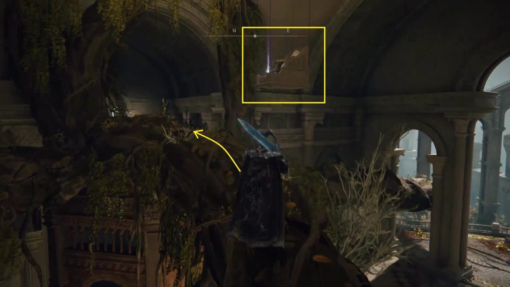 Erdtree Sanctuary Site of Grace에서 아래와 같이 동쪽 나무뿌리를 타고 올라갑니다.