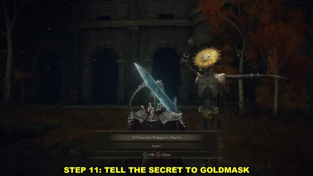 마지막으로 그를 본 Goldmask에게 가서 Radagon이 Marika라고 말하십시오. 추가 대화를 위해 Corhyn과 대화하십시오.