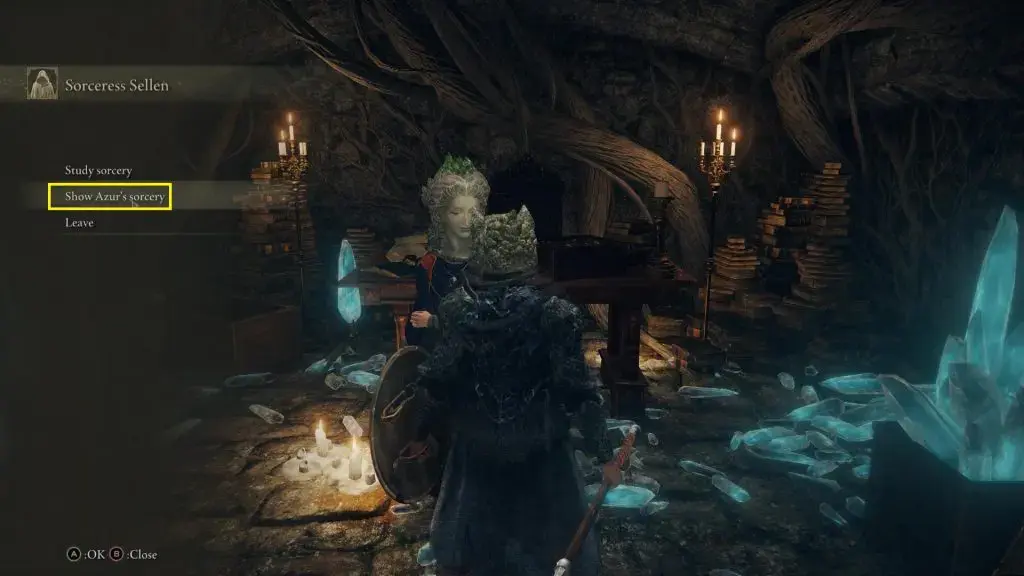 황금 표지판을 선택하면 Jerren을 죽여야합니다. 이것은 당신에게 Accentric의 갑옷 세트 를 줄 것 입니다. 싸움이 끝난 후 Sellen과 대화하면 그녀가 Glintstone Kris 단검을 줄 것입니다. 마녀의 글 린트 스톤 왕관 은 아래와 같이 라이브러리에서 수집할 수 있습니다 . 그녀의 상점에서 주문을 구입할 수도 있습니다.