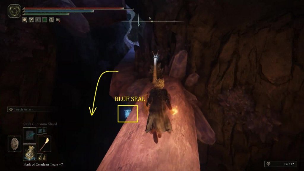 그런 다음 똑바로 걸어 아래 왼쪽에 있는 수정 위로 뛰어내립니다. 아래 그림과 같이 아래에 파란색 봉인이 있는 것을 볼 수 있습니다. 여기에서 아래로 내려가면 맨 아래 레벨에 도달합니다.